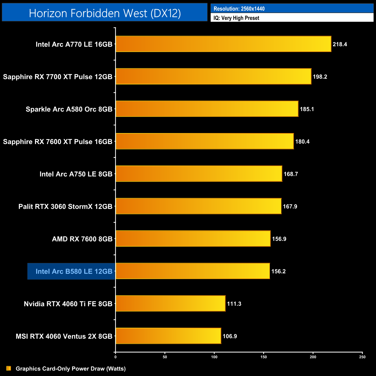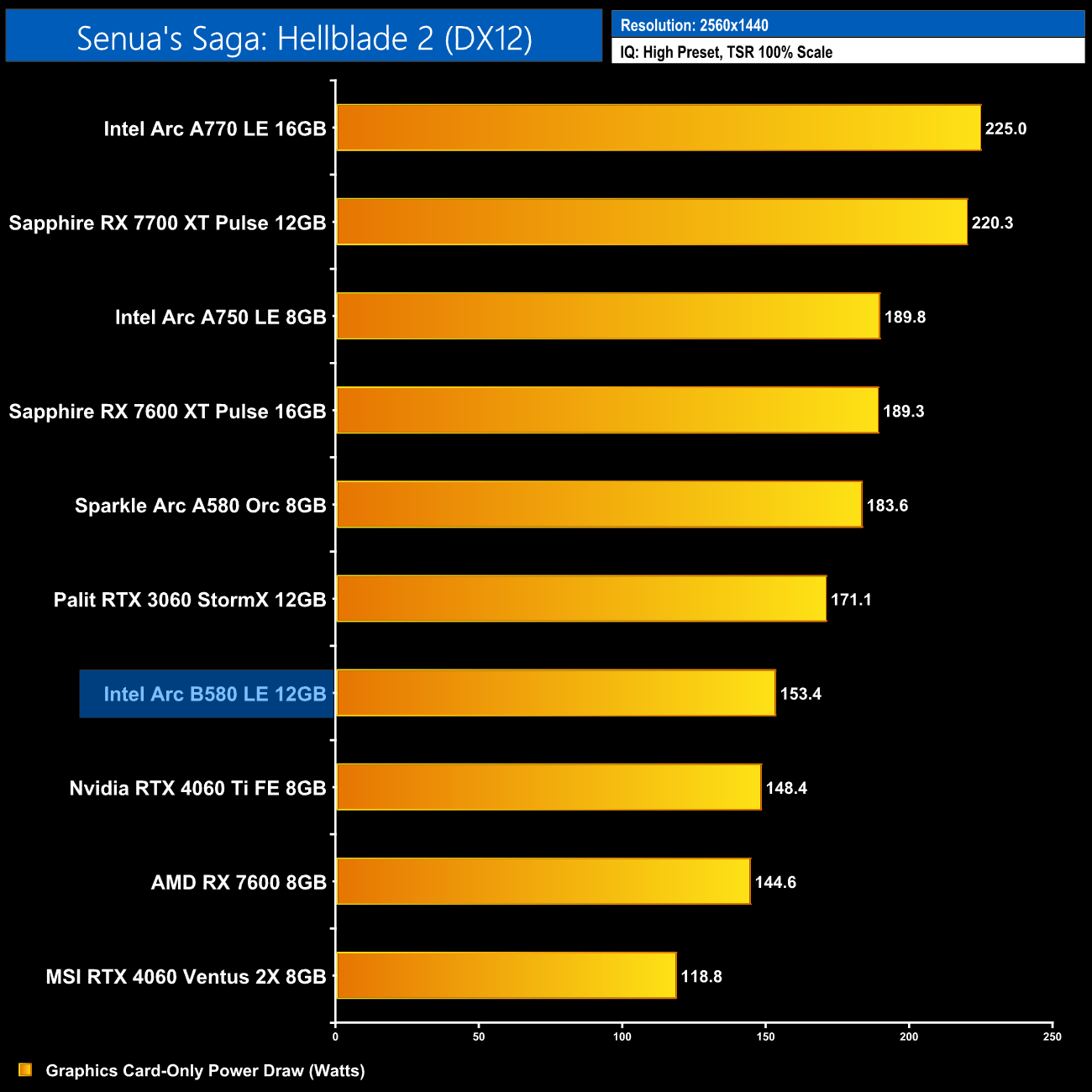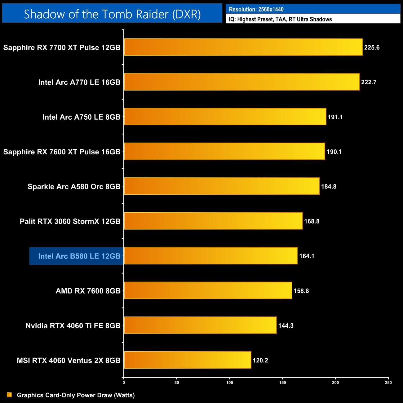 Even at 1440p, the B580 doesn't draw close to its 190W TBP, averaging 160.6W in my testing. That's about 30W less than the A750, despite being significantly faster, so that bodes well for our efficiency data which we'll get to in a minute.