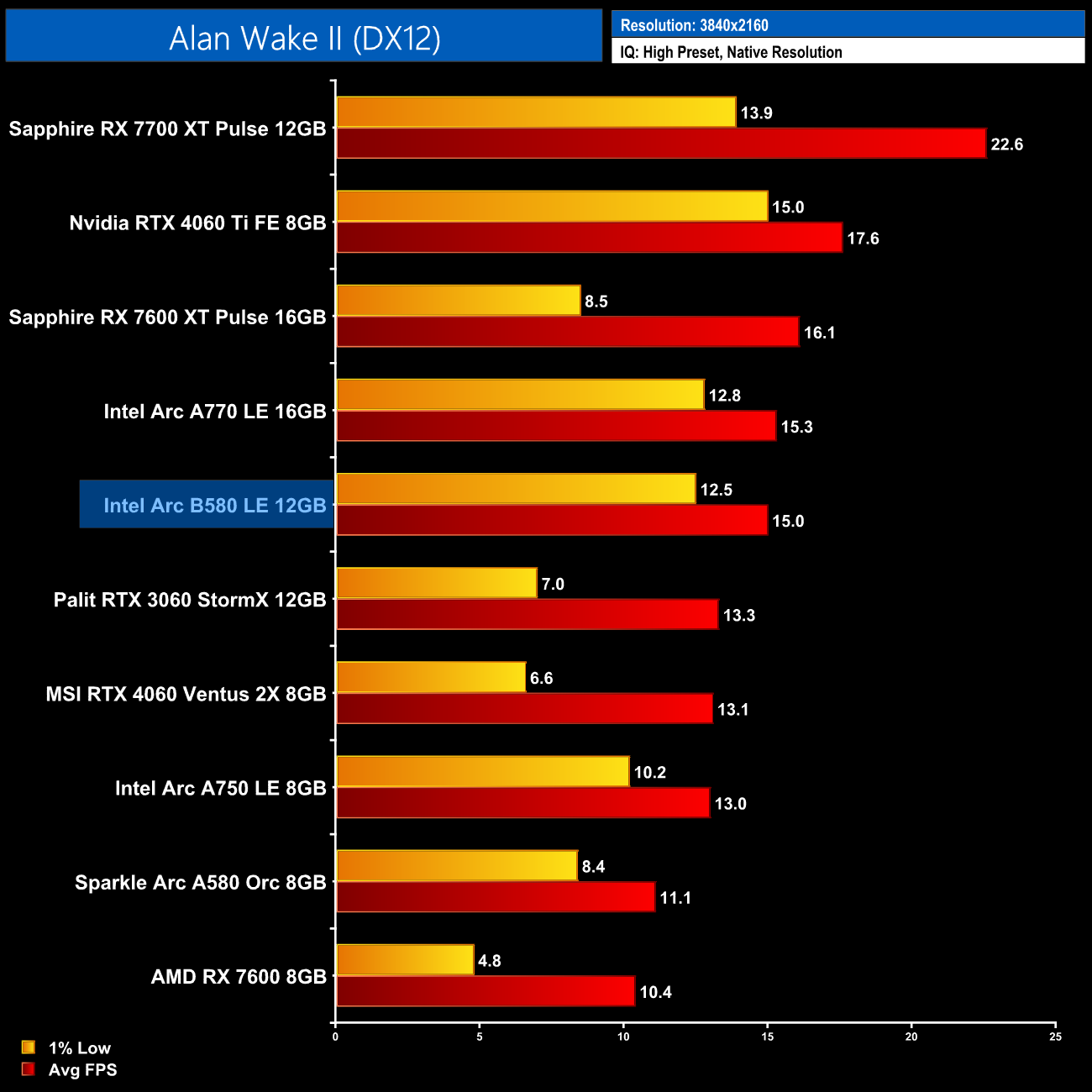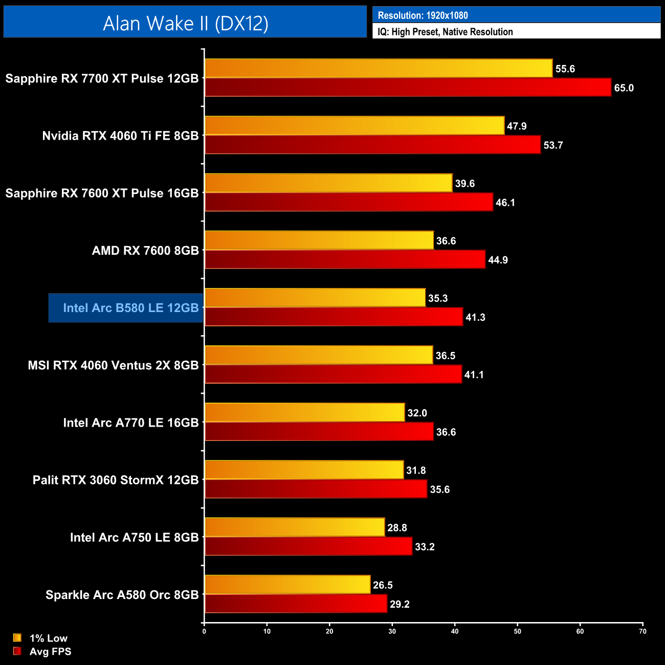 Our first game of the day is Alan Wake II, where at 1080p the B580 delivers 41fps, putting it dead level with Nvidia's RTX 4060. It's also just a handful of frames behind the RX 7600 and 7600 XT, but delivers a 24% uplift over the A750.