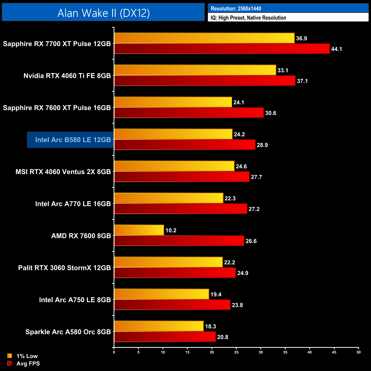 1440p is too stern a test without using some form of upscaling – which we do not test with – but the B580 is still very similar to the RTX 4060 and RX 7600 XT in terms of performance.