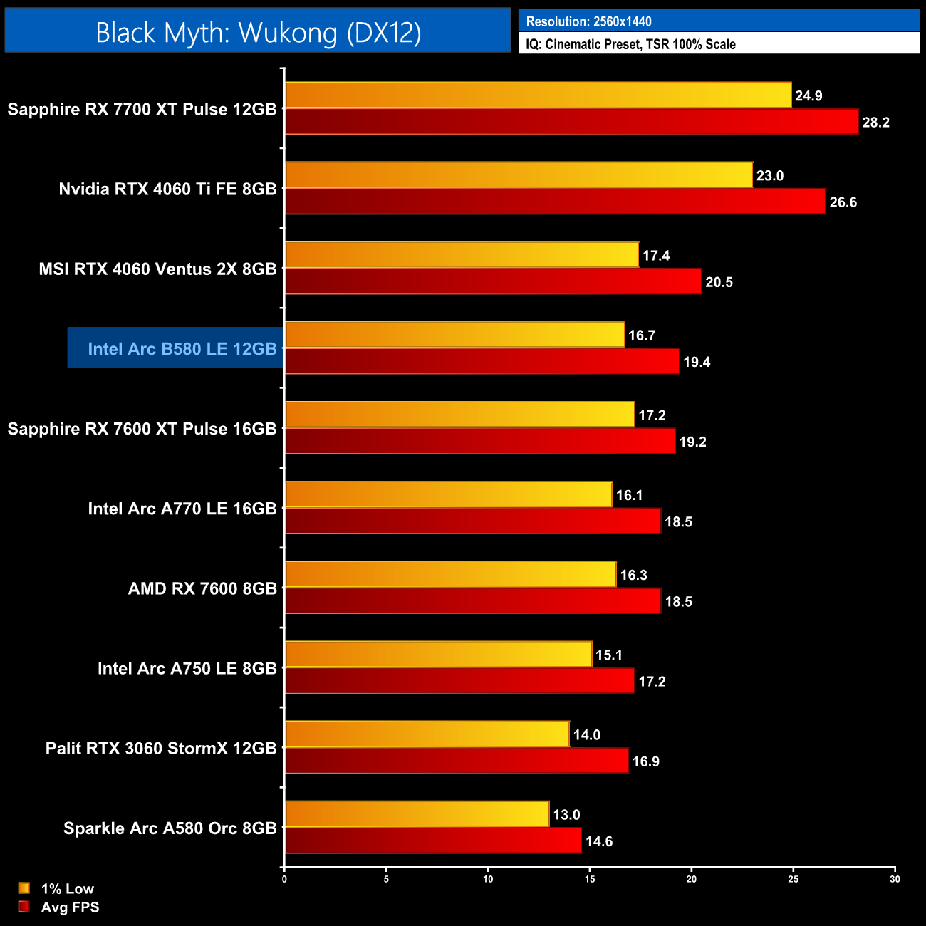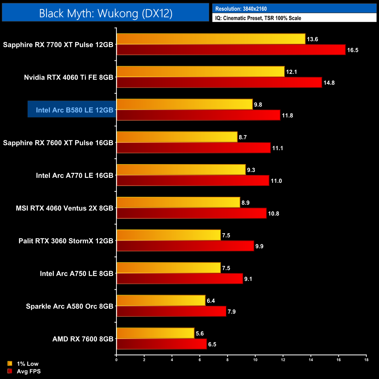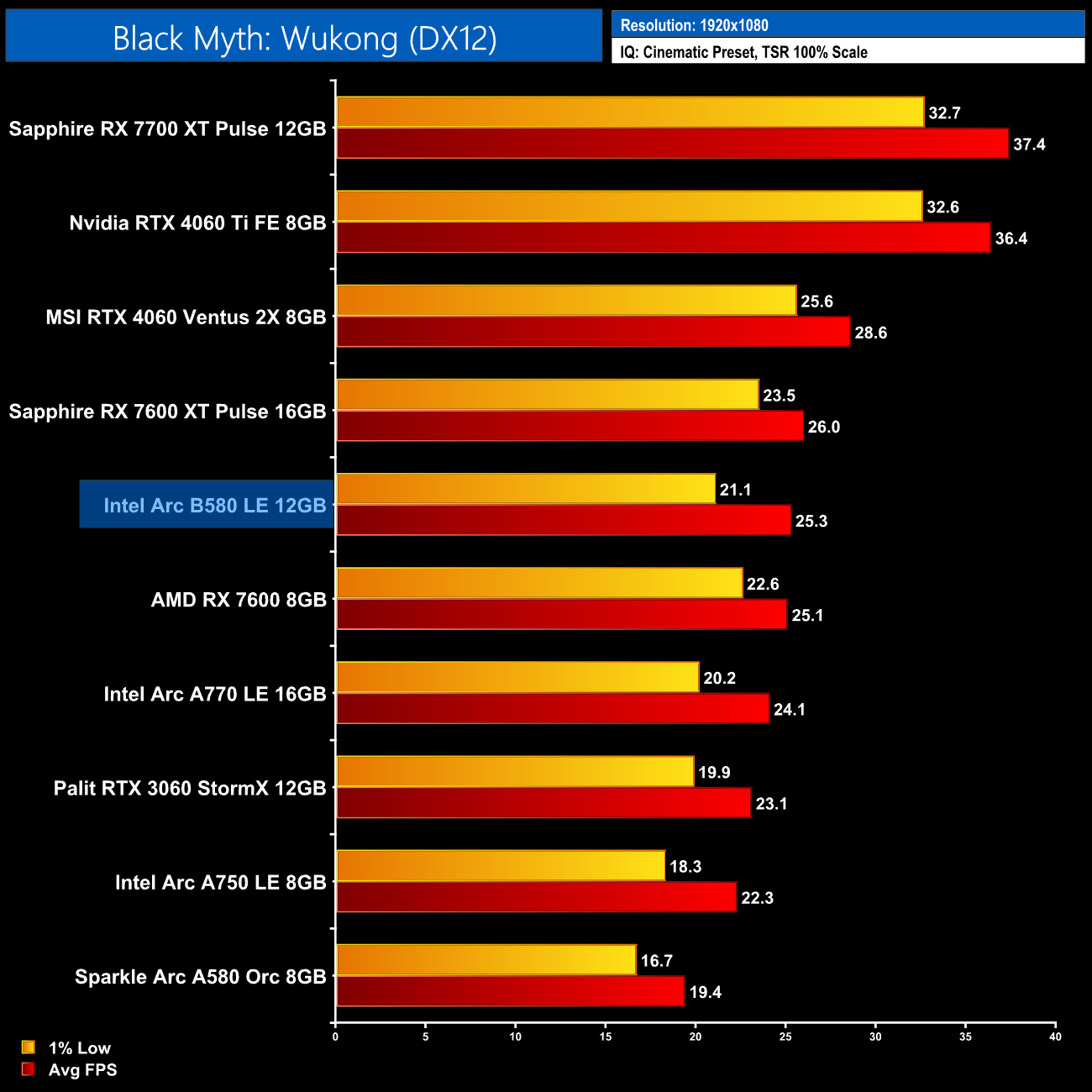 Black Myth: Wukong is a new addition to our test suite and I hadn't realised quite how punishing the Cinematic preset is! At native 1080p, this calibre of GPU struggles to hit 30fps, though we do see a 12% deficit for the B580 versus the RTX 4060.