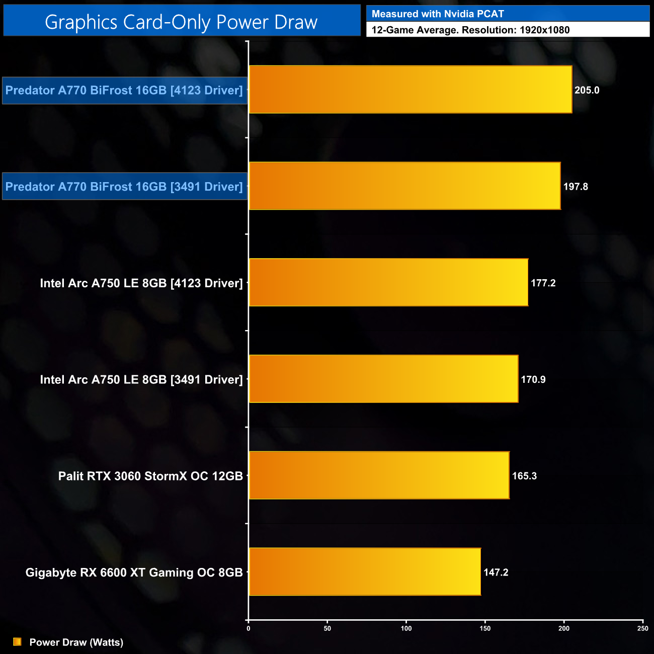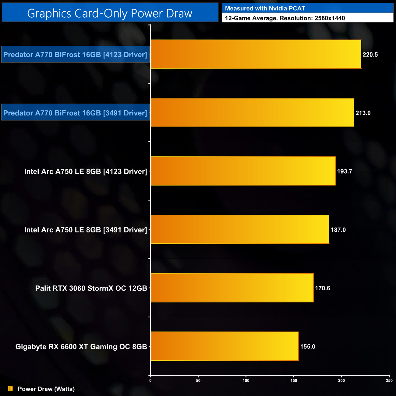 It's also interesting to see how the 4123 driver brings with it an increase in power consumption for the Intel cards. Not by much – the A770 draws just 7.5W more at 1440p with the 4123 driver than with 3491 – but there were a number of occasions across the 12 games where a large performance increase had a direct correlation with a power draw increase, suggesting the GPU wasn't being fully utilised previously.