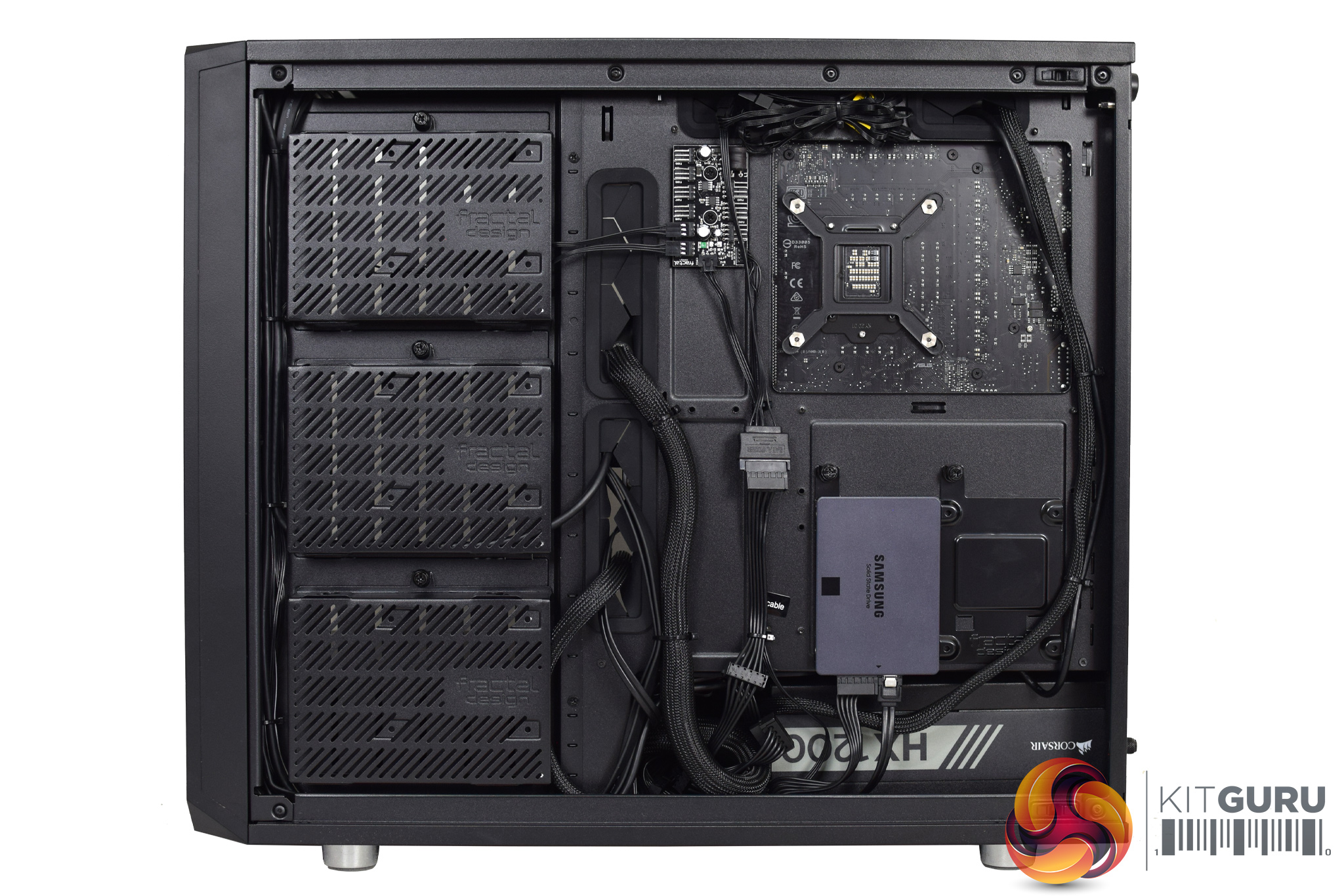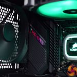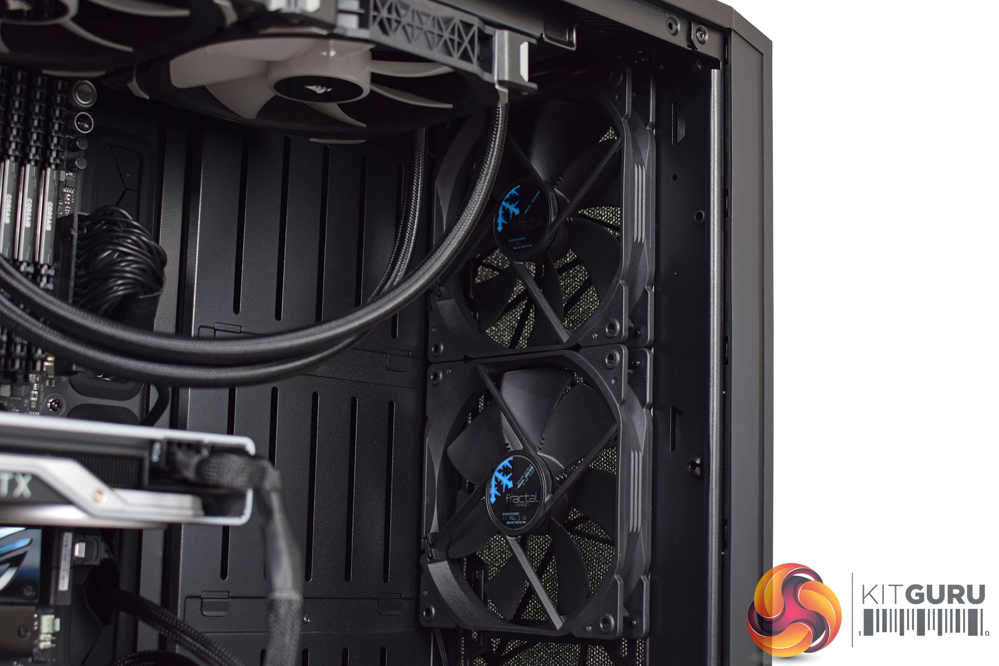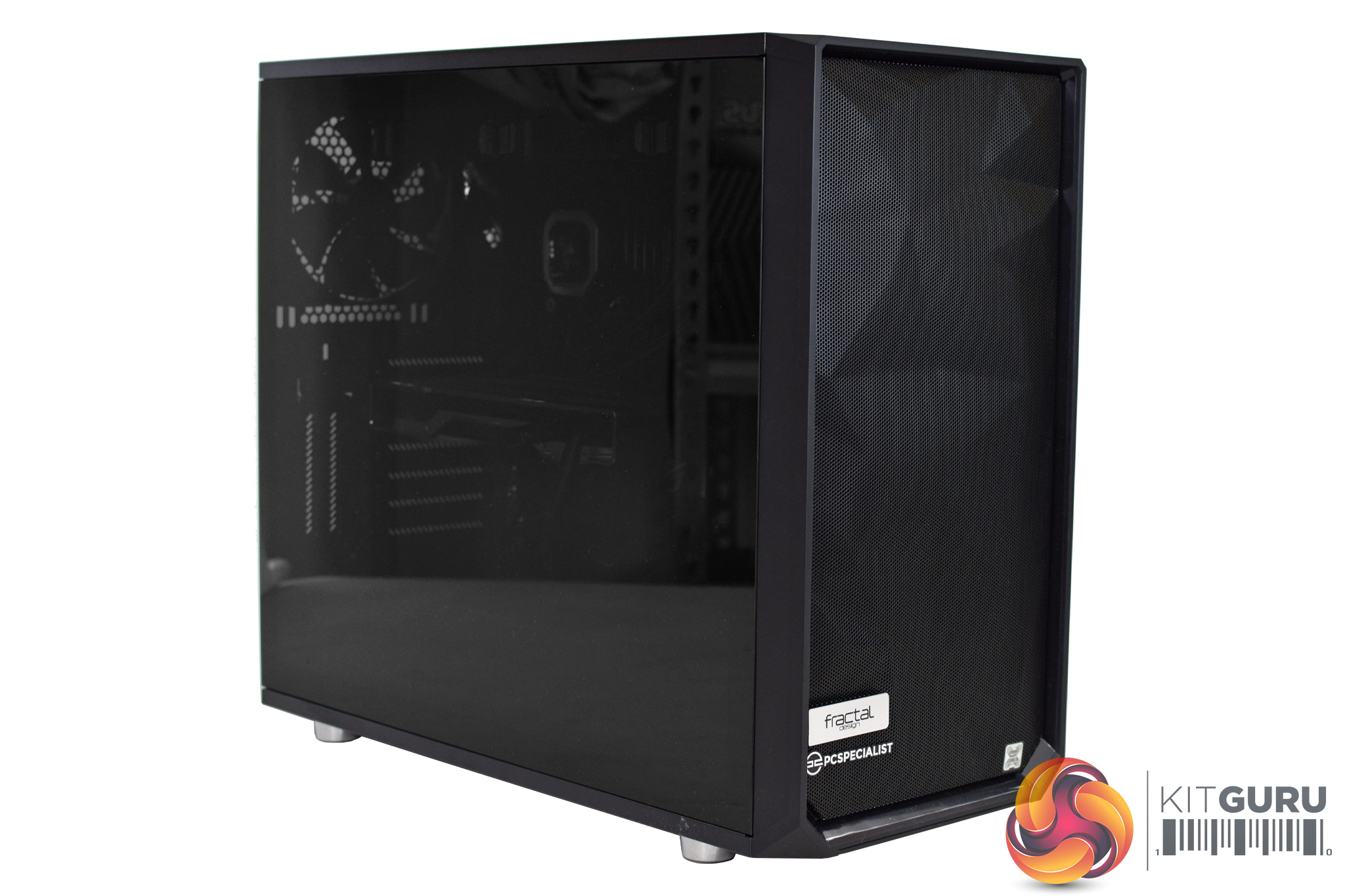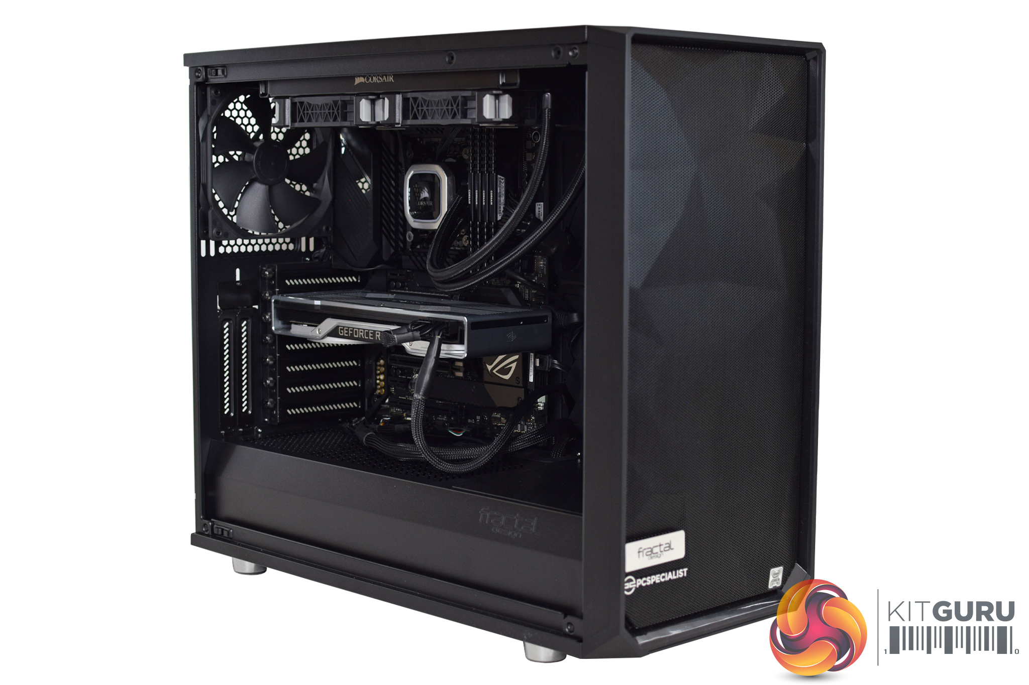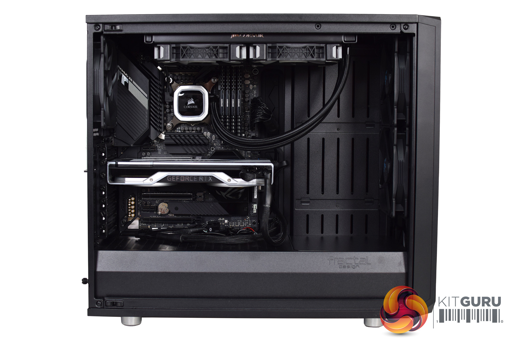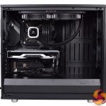 Of course, we also wanted a high airflow case so the graphics card isn’t going to be choked, so here we have the excellent Fractal Design Meshify S2. This uses two 140mm intake fans at the front, with one exhaust at the rear, while the two fans from the AIO are also exhausting through the roof.