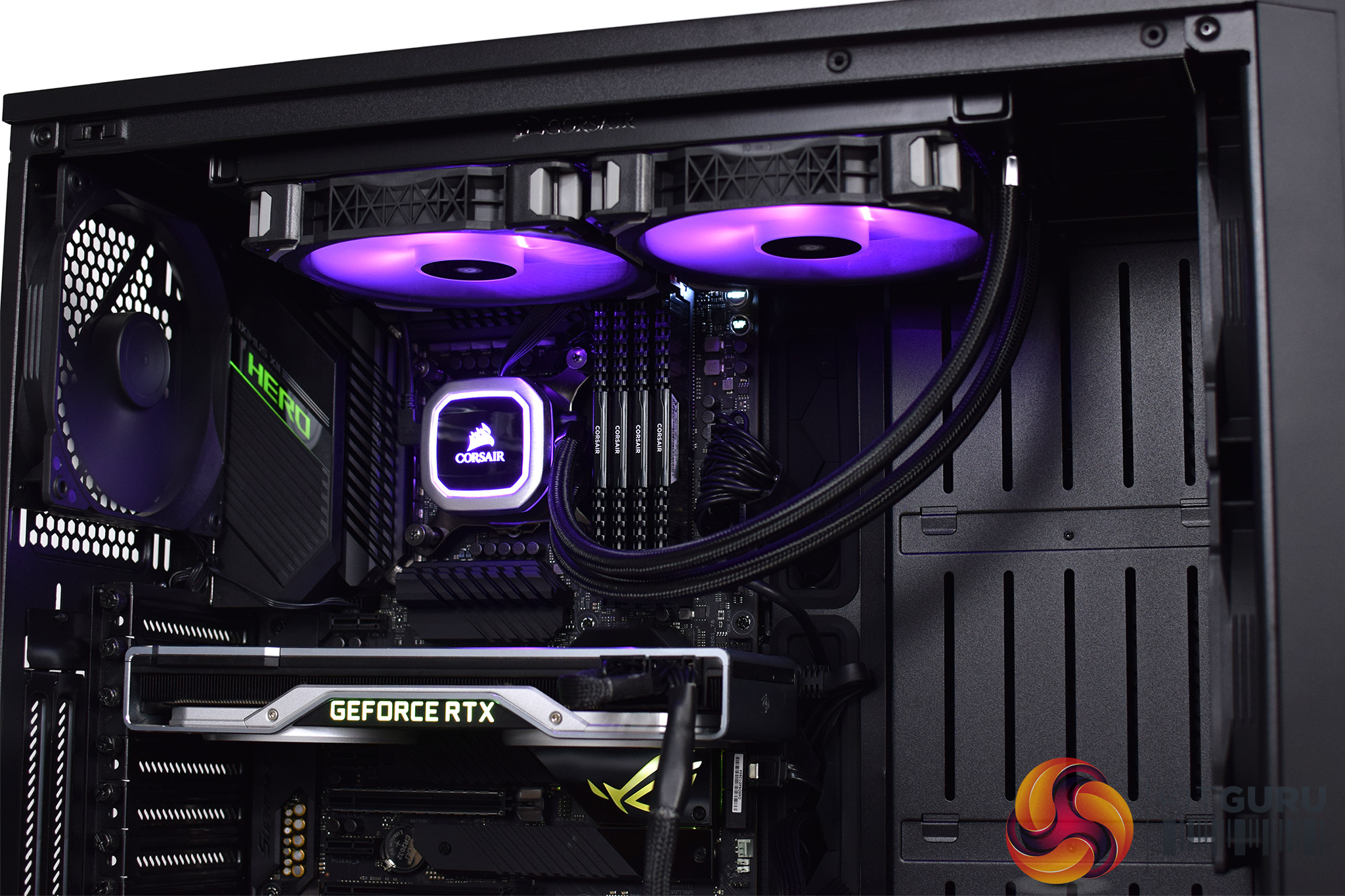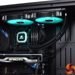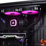 Cooling the i9, we have Corsair H115i RGB Platinum 280mm AIO. This not only adds some RGB pizzazz to the system, but it offers more than adequate cooling. Temperatures after a 30-minute 3DMark Time Spy stress test didn’t go above 60C for the processor, and as this machine is going to primarily be running games, it is more than enough for our needs.