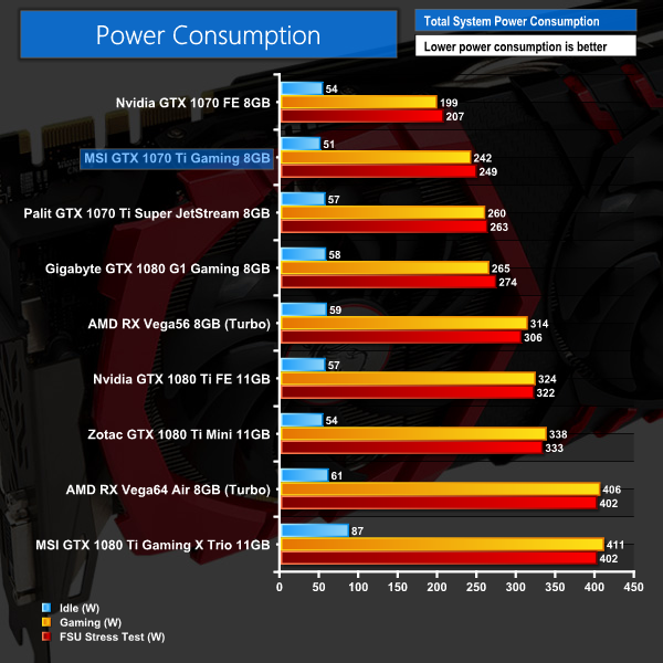 Not surprisingly, both GTX 1070 Tis draw more power than a 1070 and less than a 1080. Of the two, the MSI card is marginally less power hungry – though that is perhaps to be expected given its performance was always slightly behind that of the Palit.