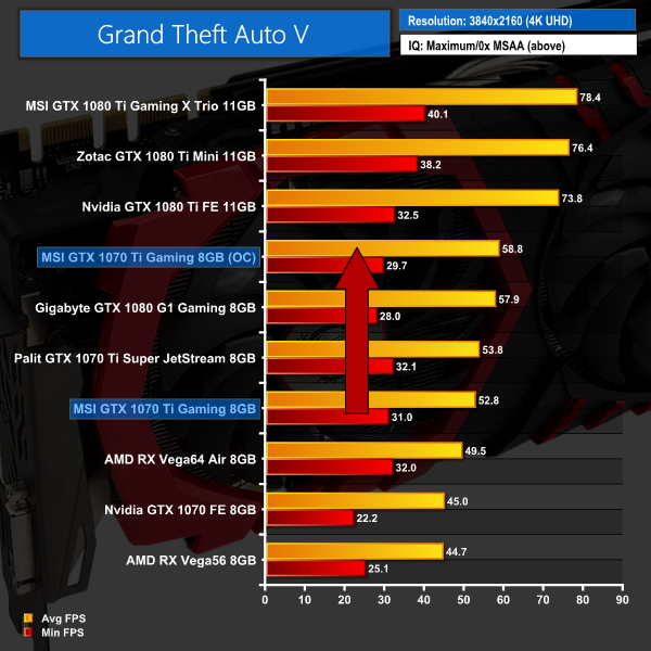 The +180MHz overclock brought hefty gains. Left at stock settings, the Gaming 8G's core frequency would settle at around 1720-1730MHz. But with the overclock applied, the card was bouncing around between 1960-1999MHz and that brings tangible gains.