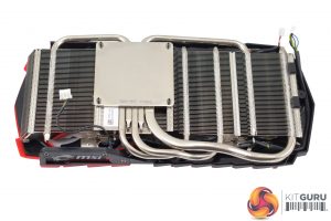 Taking the heatsink off reveals the Gaming 8G's PCB and cooler design. The heatsink itself is pretty conventional in that it uses a nickel-plated contact area which transfers heat to 5 nickel-plated heatpipes. At least 2 of these are of the 8mm variety, something which should aid heat dissipation.