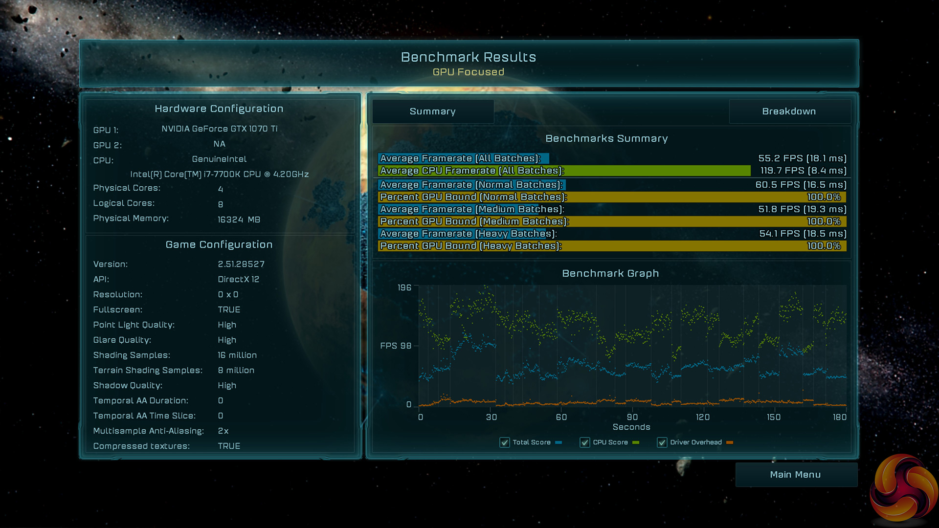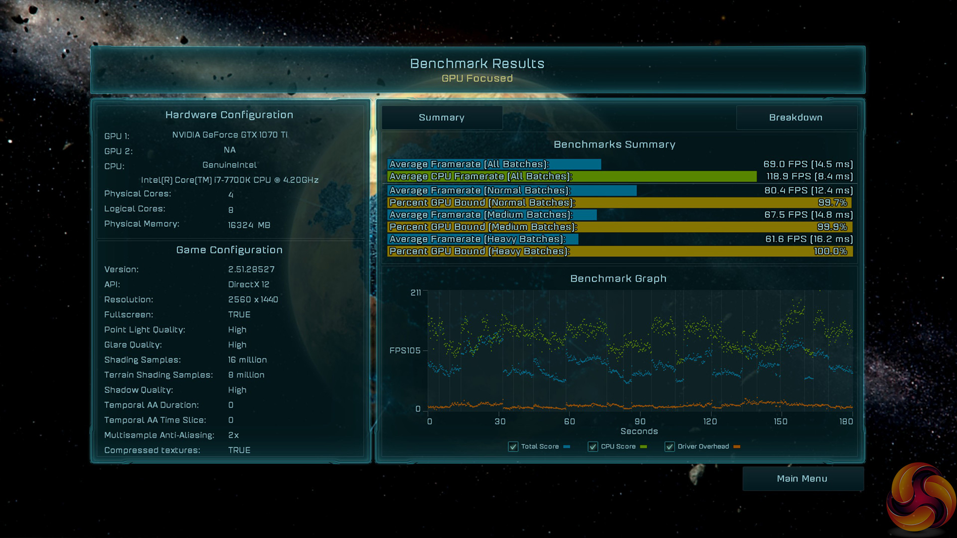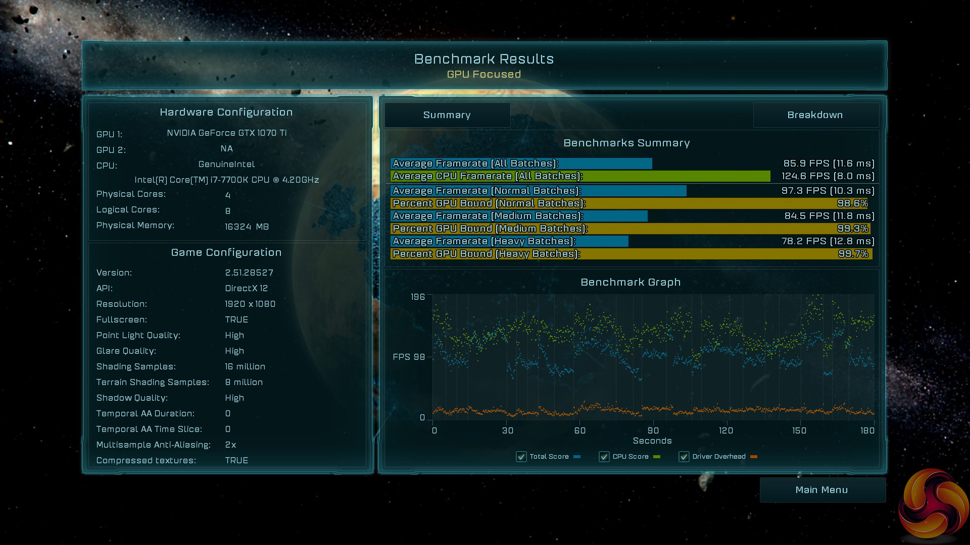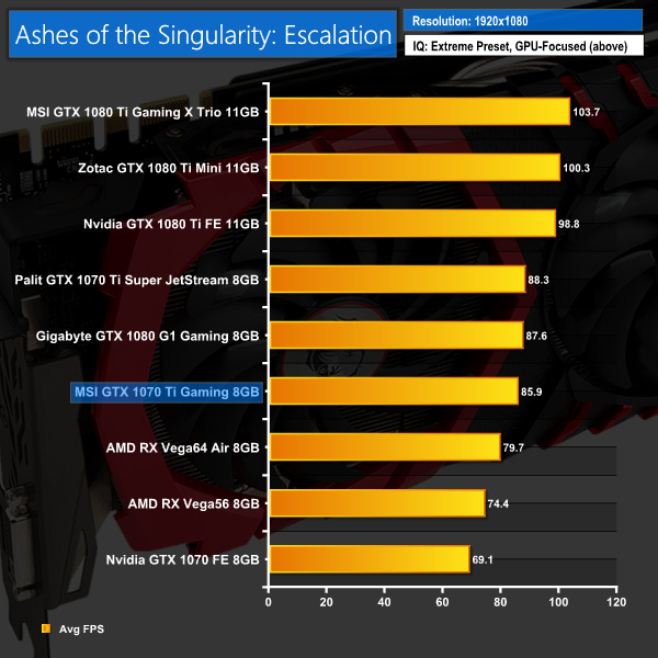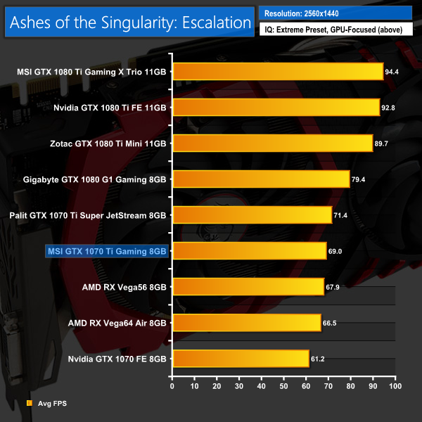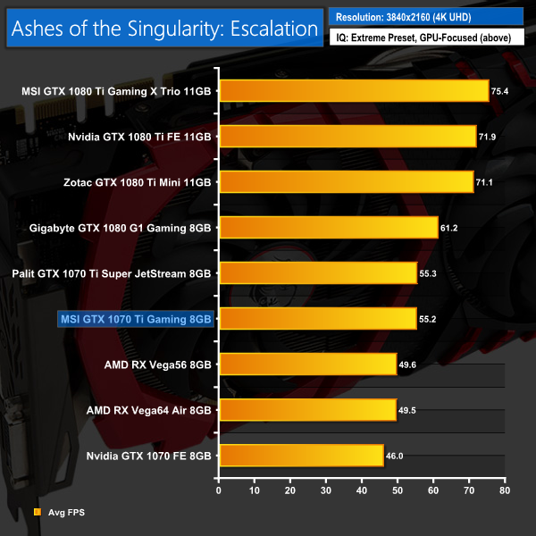 In our first game test, the Gaming 8G stays ahead of both Vega56 and Vega64 across all three resolutions tested. The Palit Super JetStream does have the upper hand, though, and there is still a reasonable gap between the 1070 Ti and 1080.