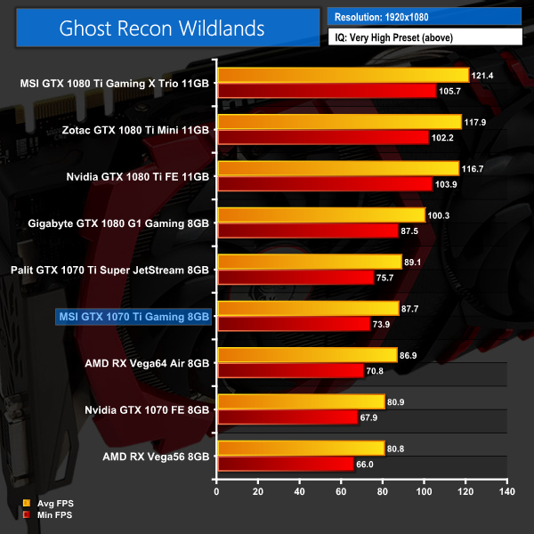 In Wildlands we see the 1070 Ti Gaming 8G nudge ahead of Vega56 across all three resolutions. GTX 1080 maintains a healthy performance lead.