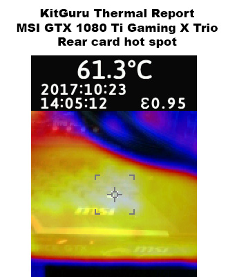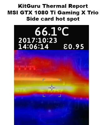 Moving on to our thermal images, and as expected there is nothing to worry about here. We noticed a hotspot on the rear of the card, just above the MSI logo and LED strip, but that peaked at just over 61C – well within thermal limits. On the side of the card, the hotspot here was also positioned above the MSI logo, and that peaked at 66.1C. So nothing at all to worry about, the Gaming X Trio cools very well.