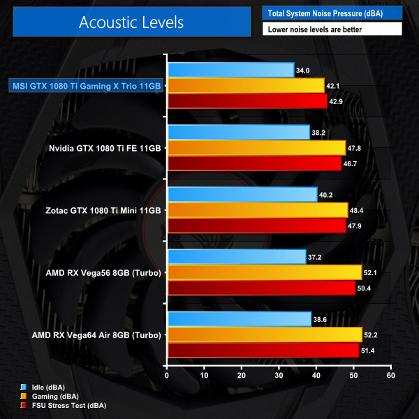 Noise levels were measured after 5 minutes under three scenarios: desktop idle, Deus Ex: Mankind Divided at 4K, and the Fire Strike Ultra stress test.