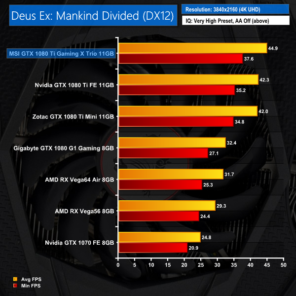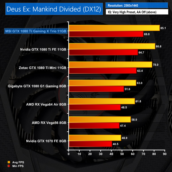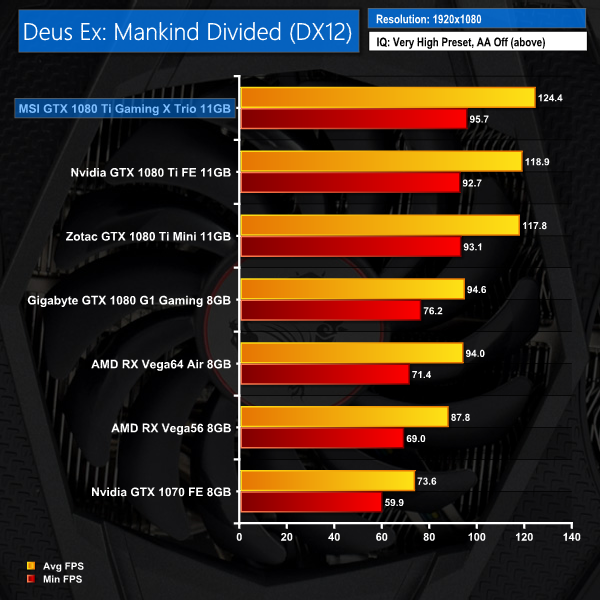 The Gaming X Trio opens up quite a lead at 1080p – 5.5 FPS faster than Nvidia's FE card. While the MSI card couldn't maintain that gap at 1440p or 4K, it is comfortably the fastest card at all three resolutions.