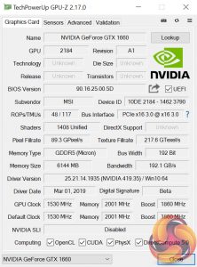 The other notable change between GTX 1660 and 1660 Ti is the memory. Instead of using GDDR6 memory, the card reverts back to GDDR5 – and that is ‘just' GDDR5, not the faster GDDR5X which debuted with the GTX 1080. Nvidia says this is because G5 gives the ‘best balance of performance and cost' – so G5X/G6 is likely just too expensive for a £200 card. There is still 6GB of memory, but as it is G5 it runs at a slower 8 Gbps, with a total bandwidth of 192.1 GB/sec – effectively the same as GTX 1060.