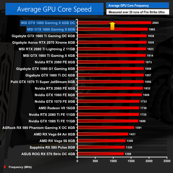 This brought the average clock speed up to 2065MHz, with a peak of 2085MHz. This is clearly a pretty decent frequency for a GTX 1660 – it will be interesting to see how other cards fare, but for now this card certainly did better than I thought it would, given the already high clock speeds out of the box.