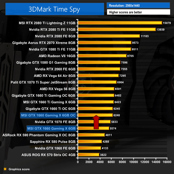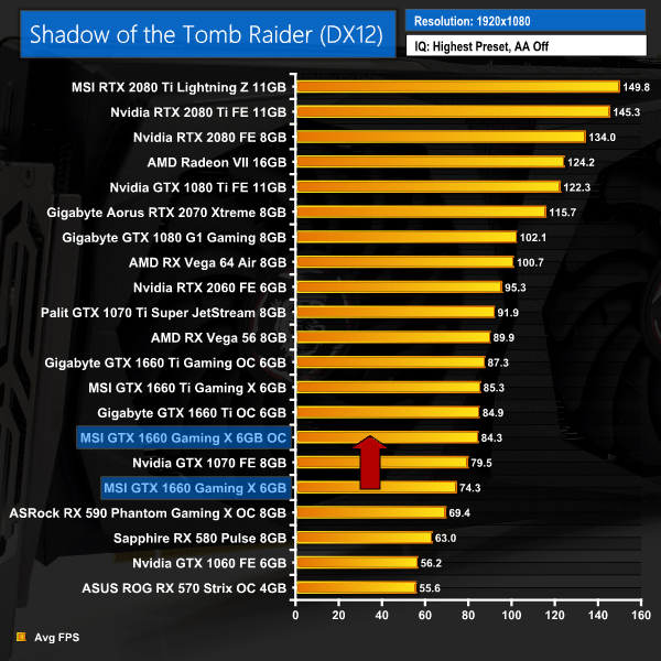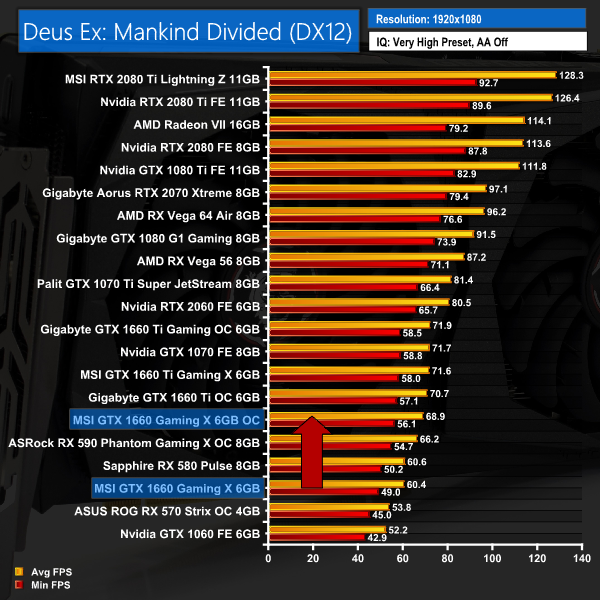 This extra frequency saw our Fire Strike score increase by a whopping 14%, with our 1080p game tests also showing similar improvements – both Deus Ex: Mankind Divided and Shadow of the Tomb Raider performed 8-10FPS better than stock, putting this card's performance within touching distance of GTX 1660 Ti.