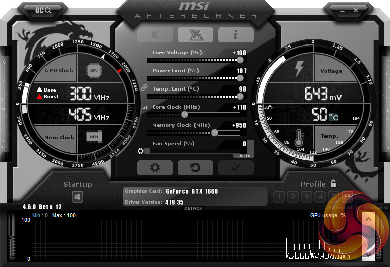 For overclocking, we used MSI Afterburner. Our best manual overclock came +110MHz to the GPU and +950MHz to the GDDR5 memory.
