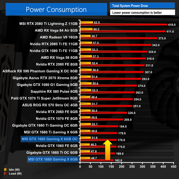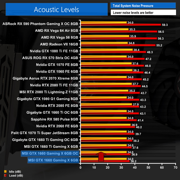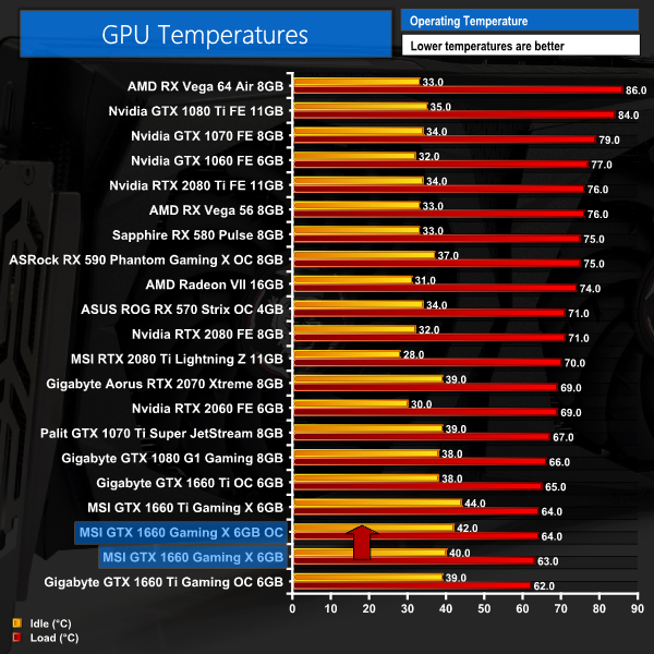 This Gaming X is able to handle the increased frequency from our overclock without any issues. GPU temperatures, for instance, rose by just 1C – and noise levels didn't even increase by a single decibel. Power draw did jump up 14W or so, but even that only puts it alongside GTX 1060, so it is still a highly efficient card even when overclocked.