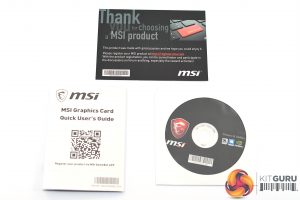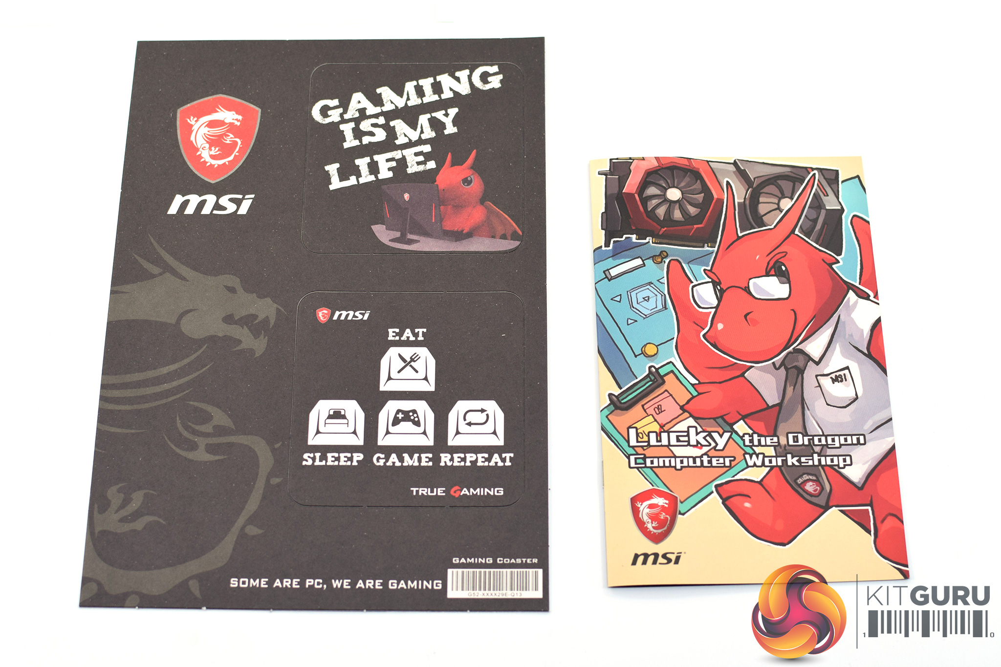 Inside, we get the usual bundle from MSI – meaning there are two coasters and a Lucky the Dragon cartoon, alongside a quick start guide, driver disk and ‘thank you’ note.