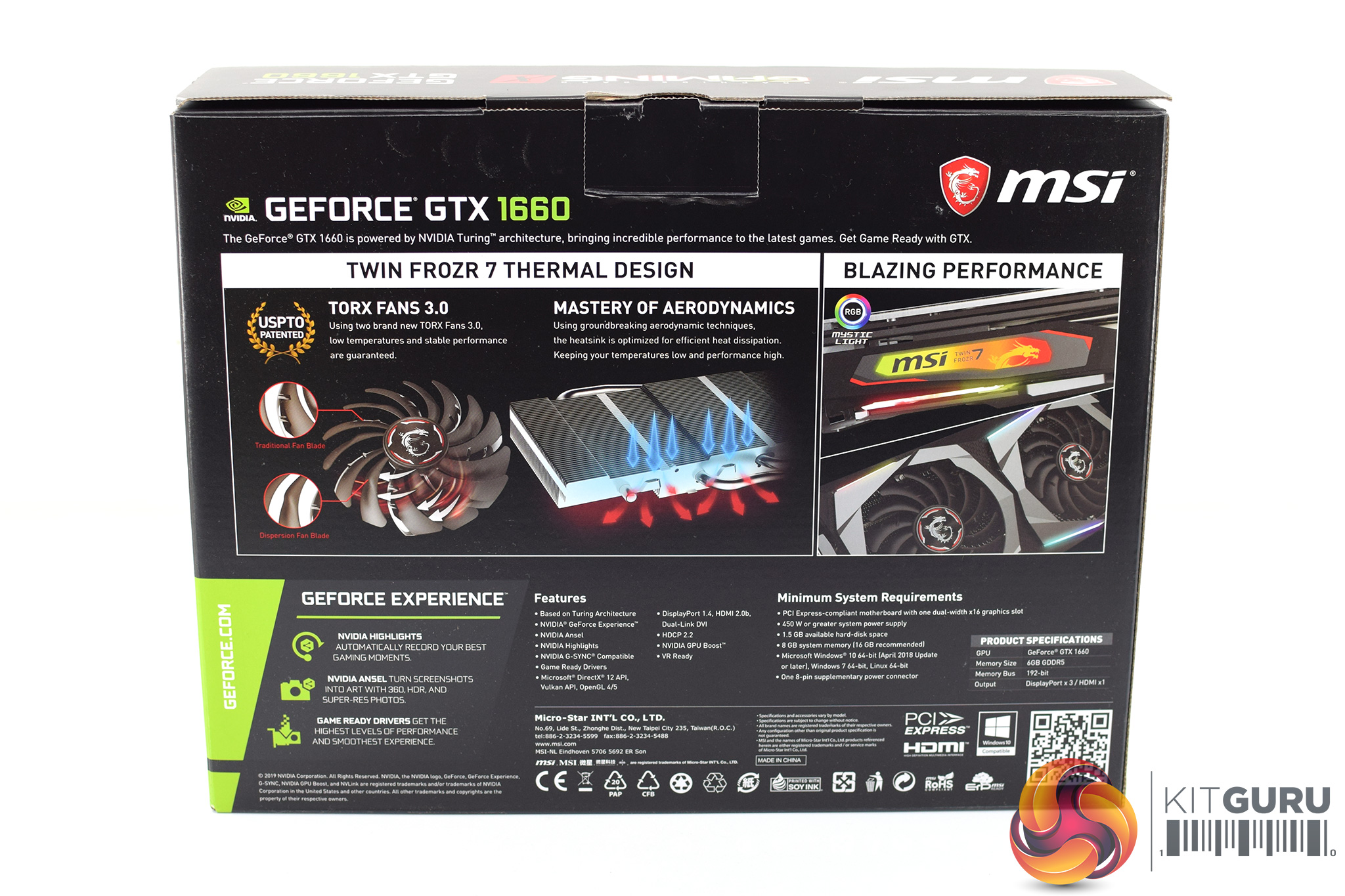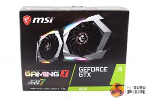 Packaging of this MSI GTX 1660 Gaming X is identical to the GTX 1660 Ti Gaming X we reviewed recently – a large image of the card dominates the front, while some key features of the card and cooler are highlighted on the back.