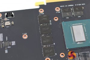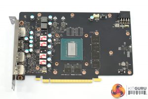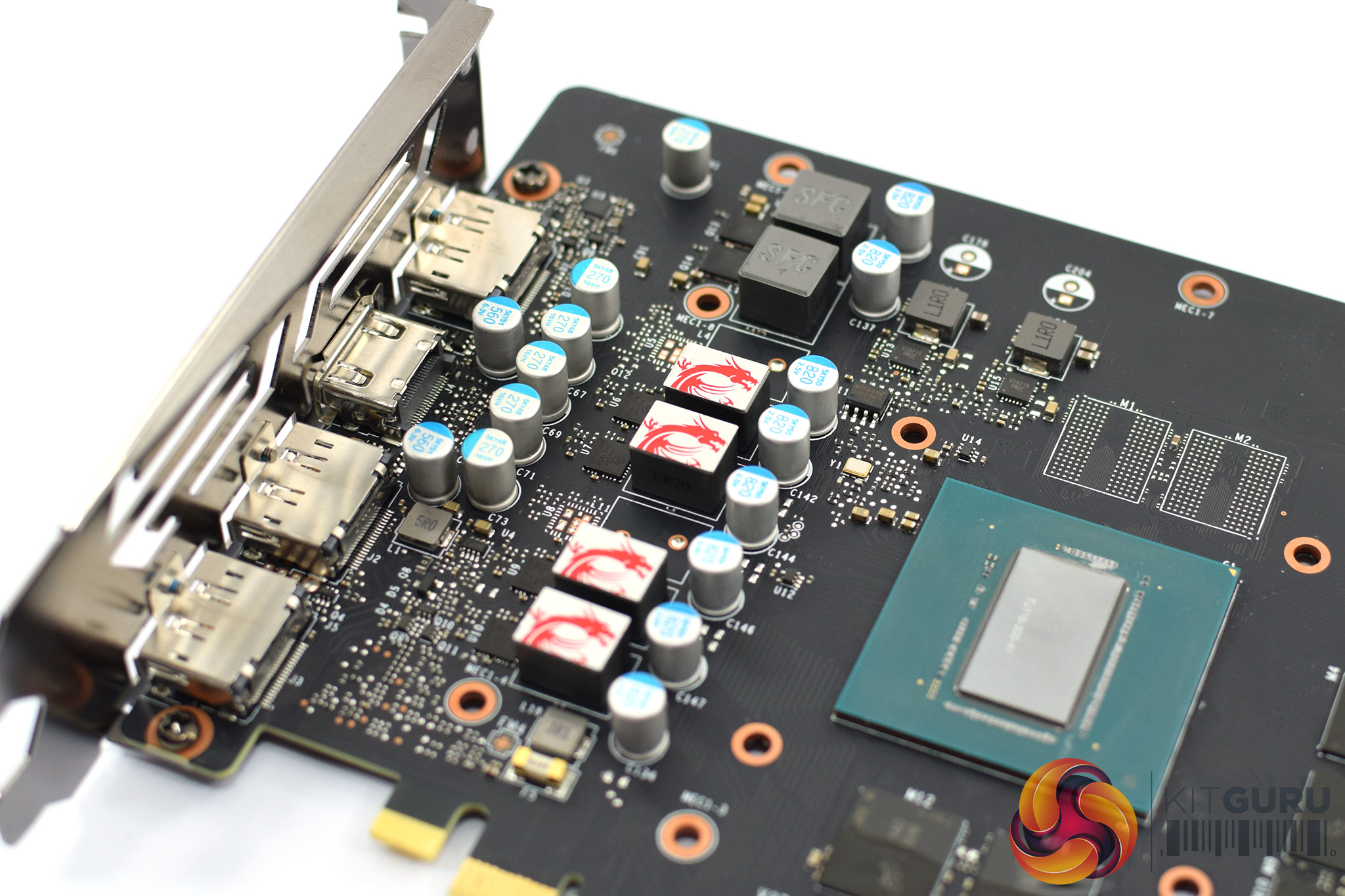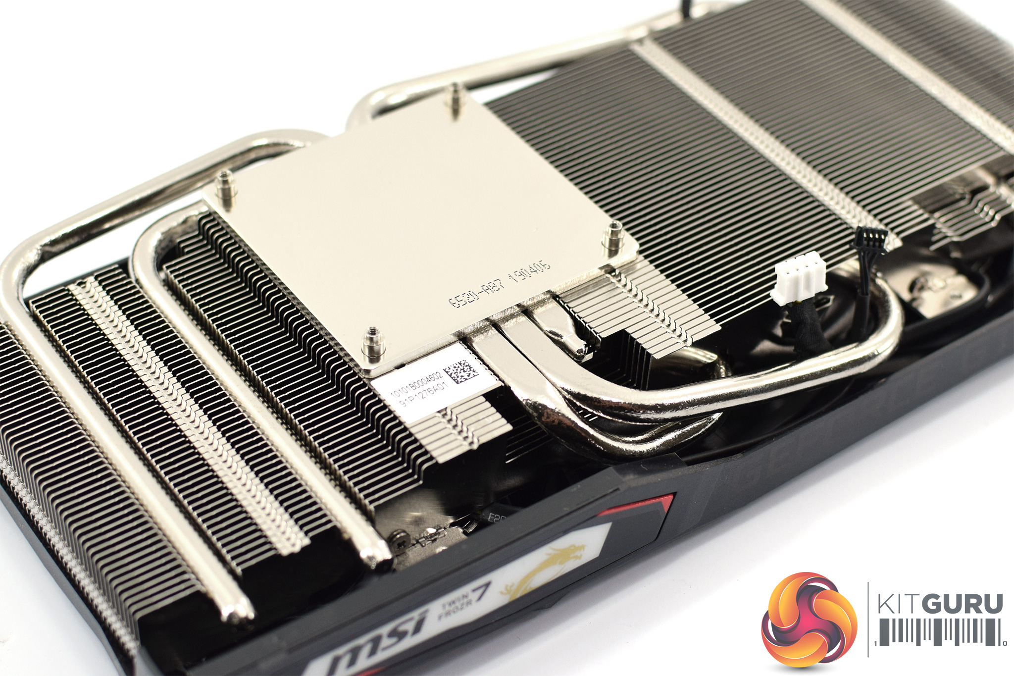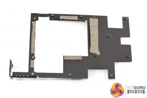Taking the card apart only requires the removal of four screws from the back of the card. MSI is using another die-cast metal frame to cover most of the PCB, though, and this acts as a heatsink for the VRAM chips as well as the MOSFETs.