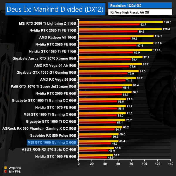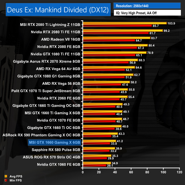 Deus Ex: Mankind Divided puts the GTX 1660 closer to the RX 580 at 1080p, with the RX 590 about 6FPS faster. At 1440p, however, things level out with the RX 590 barely 2FPS faster than the 1660.