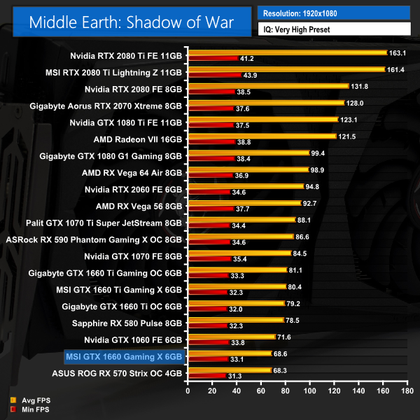 Now, this is where I have to scratch my head – for an as yet unknown reason, the MSI GTX 1660 performs marginally worse than GTX 1060 at 1080p, and then barely any faster at 1440p. This is clearly an anomaly as 1660 has (and should) outperformed 1060 across all of our other tests. Yet, no matter how many times I ran the benchmarks – I tried re-installing the driver, re-seating the card etc – the results stayed the same.