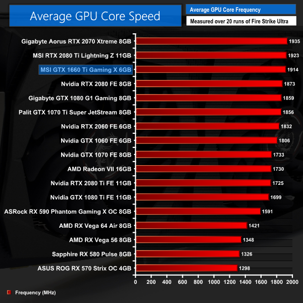 MSI's GTX 1660 Ti Gaming X is a factory overclocked model – its rated boost clock of 1875MHz is 105MHz faster than reference speeds. Even then, thanks to GPU Boost, we saw this card exceed that rated boost clock as its frequency averaged 1914MHz throughout 20 runs of Fire Strike Ultra. This is likely to be one of the fastest-running 1660 Ti cards, and thus essentially represents the best case scenario for a 1660 Ti's out of the box performance.