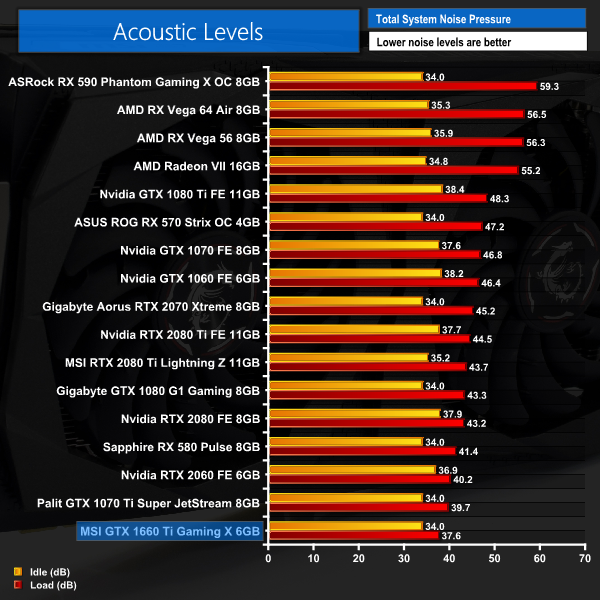 Despite being the coolest-running card on test today, MSI's GTX 1660 Ti is also the quietest – and by a decent margin, too. This is mightily impressive, as even under full load it is really very hard to tell that the fans are actually spinning. Bear in mind this is with the card on an open test bench, so once this card is installed in a case I think it is almost certain you just would not be able to hear it at all.