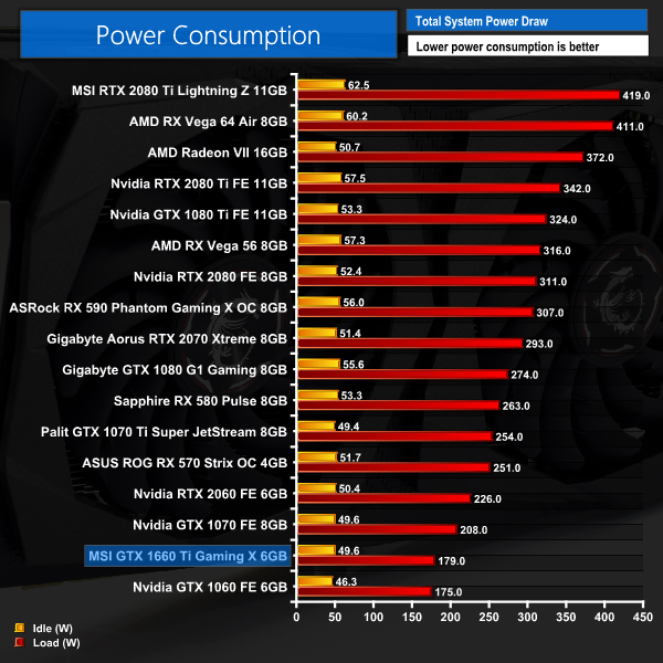 Being a factory overclocked model, the MSI Gaming X will draw slightly more power than a reference-clocked GTX 1660 Ti – probably in the region of 10W or so. Even then, power consumption is still not high – just 4W more at the wall than GTX 1060, which clearly shows very impressive power efficiency given how much faster this card is compared to GTX 1060. It will be interesting to analyse a reference-clocked 1660 Ti to see how fast one of those cards would run out of the box, and how much power it would draw.