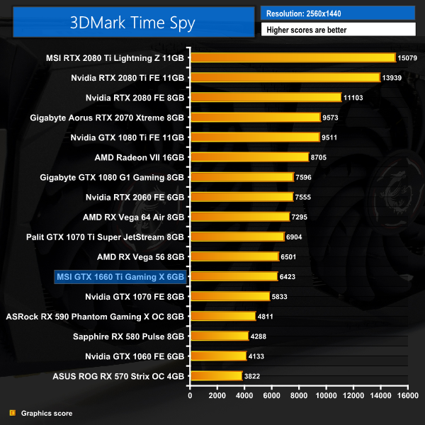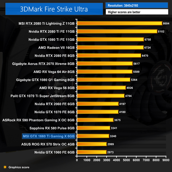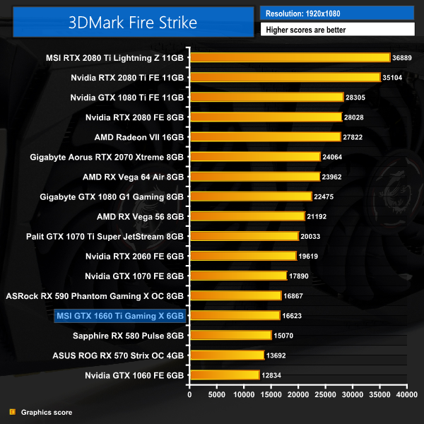 It's a bit of an ‘up and down' start for the MSI GTX 1660 Ti in our 3DMark benchmarks. It's roughly on par with the RX 590 in the Fire Strike test, before outperforming GTX 1070 in Time Spy. In the 4K Fire Strike Ultra test, however, it falls behind even the RX 580.