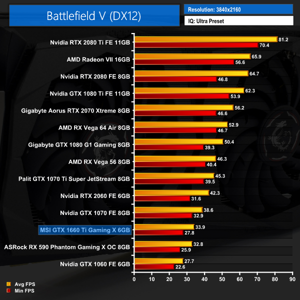 Battlefield V shows much more consistent performance for the GTX 1660 Ti, with the card edging ahead of the GTX 1070 at both 1080p and 1440p. The margins are small – 2FPS at best – but it does do better at those resolutions. At 4K, however, the GTX 1070 is able to pull ahead by almost 5FPS.