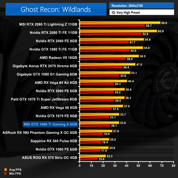Ghost Recon: Wildlands definitely favours Nvidia hardware over AMD, and we can see that in the 1080p and 1440p results where GTX 1660 Ti is effectively tied with Vega 56. That in turn puts 1660 Ti performance at pretty much the same level as GTX 1070 in this title.