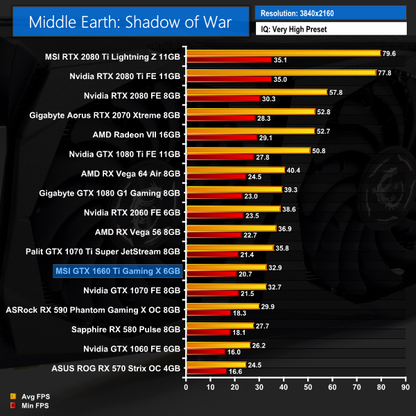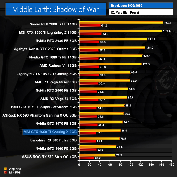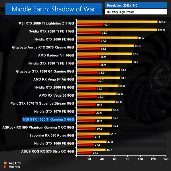 GTX 1070 holds a 4FPS lead over GTX 1660 Ti when playing Middle Earth: Shadow of War at 1080p, though this shrinks to a mere 0.3FPS at 1440p. RTX 2060 maintains a performance lead of around 17% over 1660 Ti at both of those resolutions.