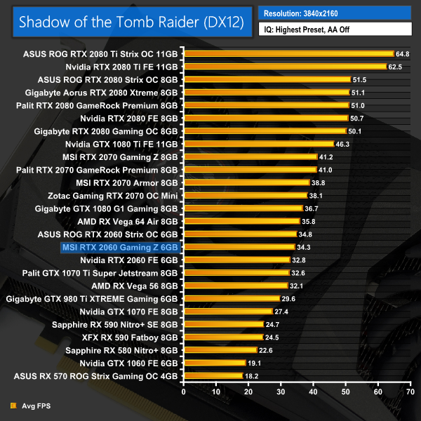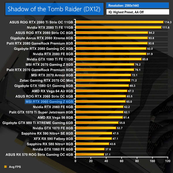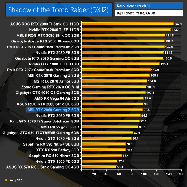 Shadow of the Tomb Raider represents our last traditional game of the day – that is to say, one that doesn't use RTX features – and here we can see a healthy lead for the Gaming Z over Nvidia's Founders Edition. It's 3.3FPS faster at 1080p, and 2.8FPS faster at 1440p – though the ASUS Strix does still edge ahead across all three resolutions.