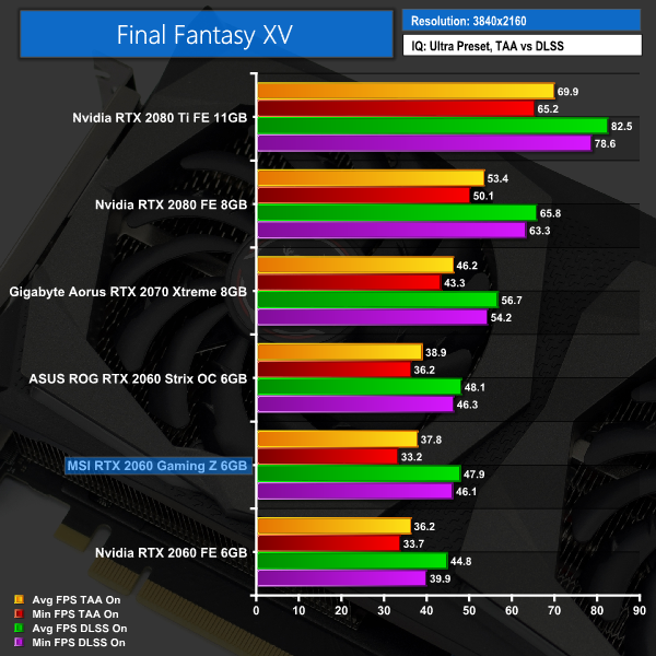 Our last game of the day, when we come to FFXV the Gaming Z outperforms the Founders Edition 2060 but sits just below the Strix 2060. This is regardless of whether we used TAA or DLSS, too – given FFXV can only use DLSS at 4K it’s not an ideal situation for any of the RTX 2060 cards, but we can still see the Gaming Z out-perform Nvidia's Founders Edition.