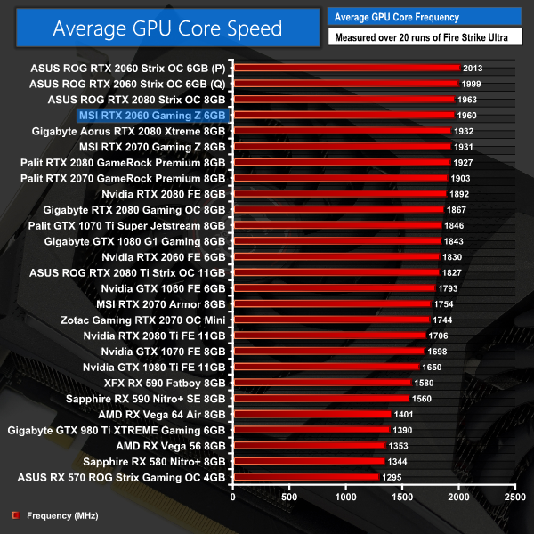 This MSI Gaming Z has a rated boost clock of 1830MHz, but as expected it runs much faster than that out of the box thanks to GPU Boost – we saw it run at an average frequency of 1960MHz. That puts it 130MHz faster than the Founders Edition 2060, and just over 50MHz slower than the ASUS Strix 2060 – which clearly explains why we were seeing this MSI card slot between the two in our games testing.
