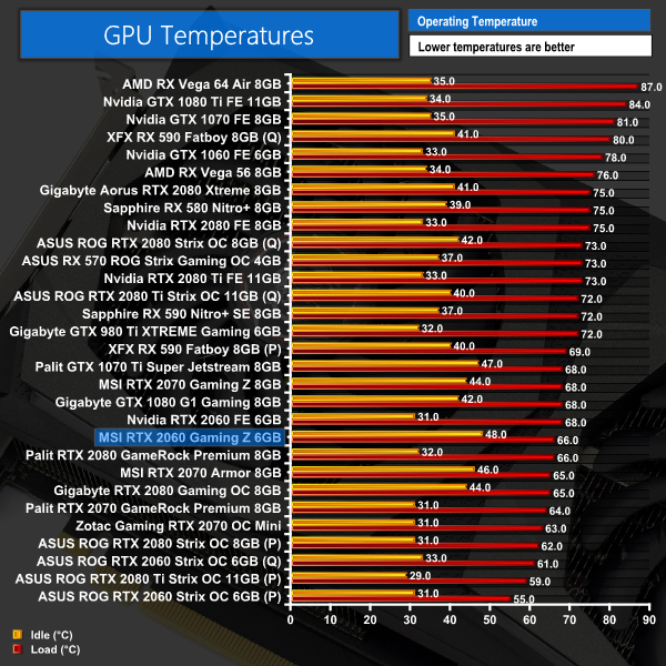 With a peak GPU temperature of 66C, the Gaming Z 2060 runs very cool out of the box. It is not massively cooler than the Founders Edition card – the difference is just 2C – but it is still a win for MSI here. The ASUS Strix model, which ran at 55C or 61C depending on the BIOS used, is definitely a cooler running card – but then again, it is also significantly larger. In any case, a peak of 66C is a top result for any card, and it's no different for this MSI.