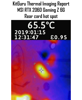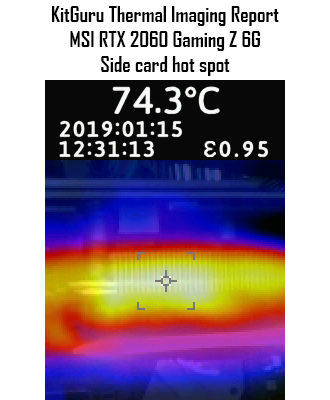 Moving onto the thermal gun, again we have excellent results here – the hottest spot on the card came from the aluminium fin stack, with a peak of just over 74C, while the rear of the card peaked at 65.5C. Both results are very good and well within tolerances for a graphics card.