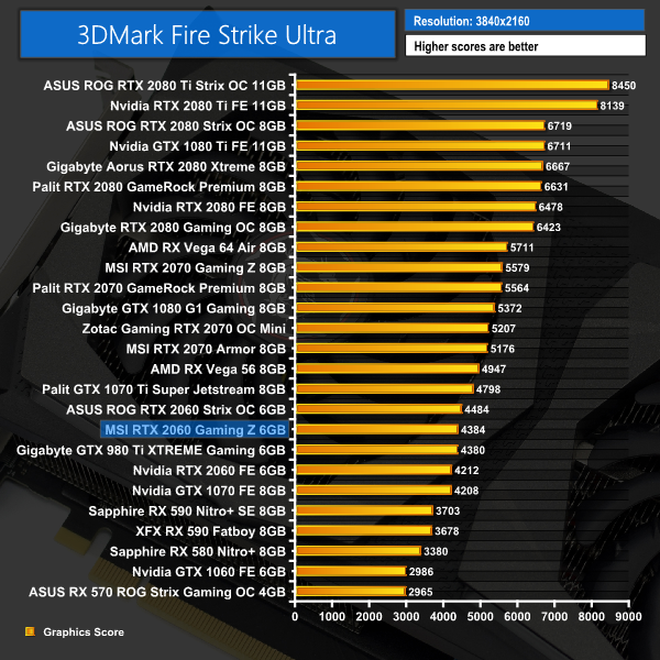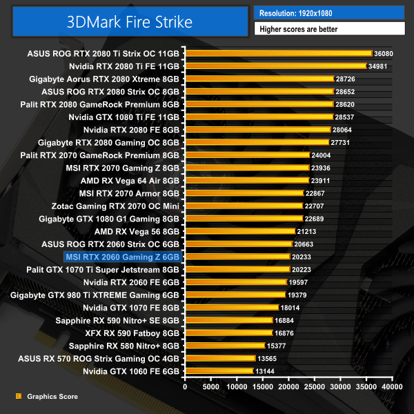 As expected, the RTX 2060 Gaming Z performs well out of the blocks, out-scoring the 2060 Founders card across all three tests. It is slightly behind the ASUS Strix 2060, but that is to be expected due that card's clock speed advantage.