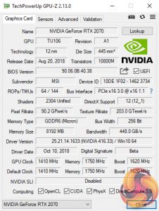 Other than that, the Armor 8G has identical specs to the RTX 2070 Gaming Z, with the same GDDR6 memory clock and thus 448 GB/s memory bandwidth. It will be interesting to look at overclocking later in the review to see how much ground the Armor 8G can regain when manually tuned to its limit.
