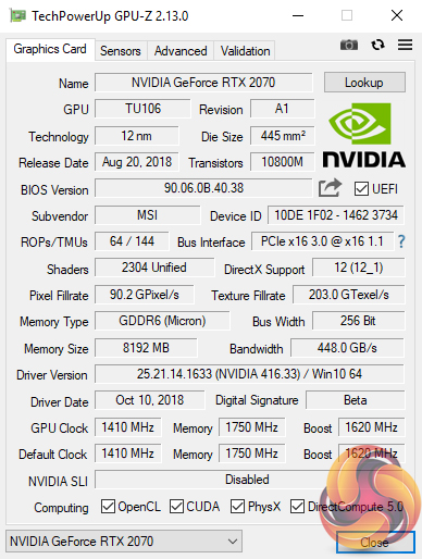 Unlike the Founders Edition RTX 2070, and MSI's own Gaming Z model, the Armor 8G does not ship with a factory overclock. Instead, it is clocked at reference speeds, meaning a rated 1620MHz boost clock – although we can still expect it to exceed this frequency in operation thanks to GPU Boost.