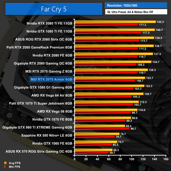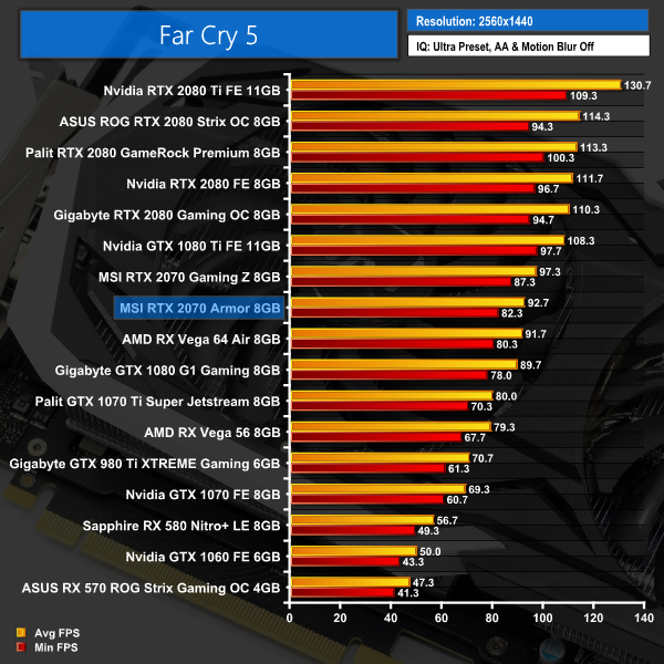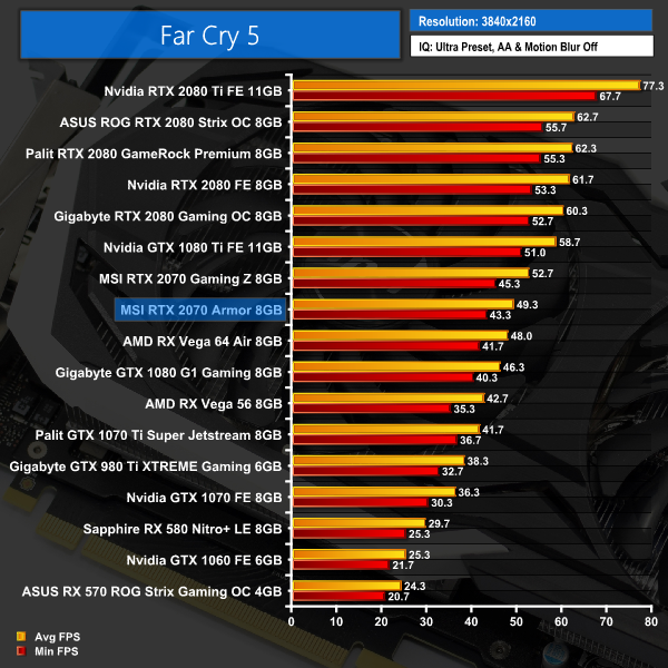 Coming to Far Cry 5, here we see the Armor 8G take a lead over the GTX 1080 at all three resolutions. At 1440p, for instance, it proved to be 3FPS faster, although this lead is cut to just 1.3FPS at 4K.