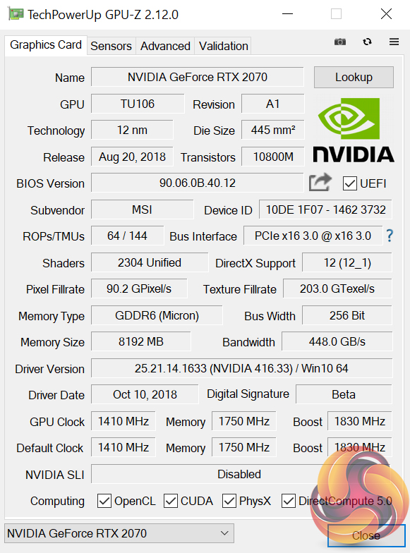 First of all – it is worth taking a quick look at the RTX 2070 specs as it has been a while since these were first announced. The 2070 uses the TU106 GPU which is equipped with 2304 CUDA cores, 144 texture units and 64 ROPS. As part of the Turing architecture, the 2070 also boasts 288 Tensor cores and 36 RT cores.