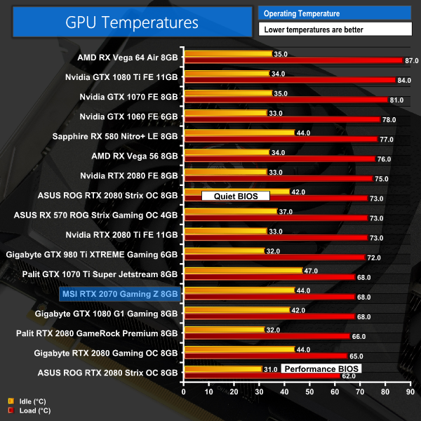A peak of 68C is a very good result for an aftermarket card – we can't say how much cooler than the Founders 2070 this would be, but you can clearly see it is one of the coolest-running cards we have tested so far. The idle temperature is relatively high at 44C, but this is because the fans stop spinning once the card drops below 60C – so it doesn't idle as cool as a card that keeps the fans spinning at all times.