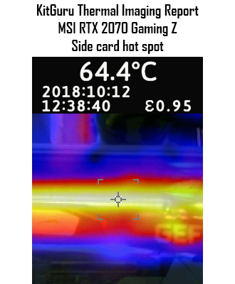 Our thermal gun shows excellent results as well, with a peak of just 64.4C on the front of the card, and 61.4C on the back – not surprisingly, this reading was taken from the area directly behind the GPU core. Still, both results are fantastic and show the 7th gen Twin Frozr cooler is certainly up to the task.