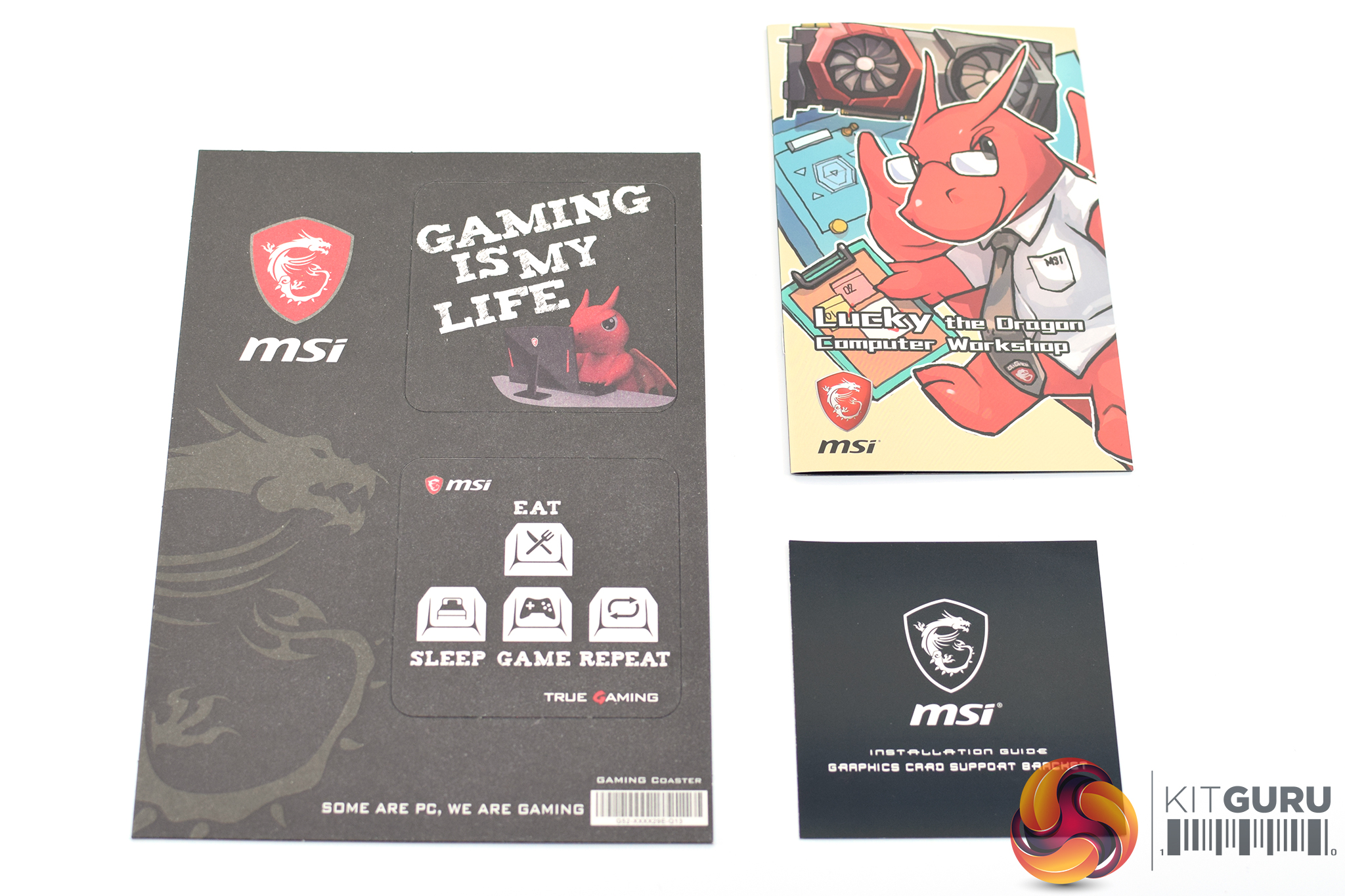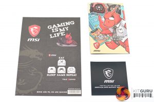 A wealth of accessories come included in the box – we find two MSI coasters, a Lucky the Dragon cartoon, a quick start guide, a driver disk, and a product registration reminder.