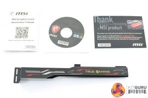 Most useful, however, is certainly the included anti-sag metal bracket. As we will see shortly, the Gaming Z is no small card, so MSI includes this fairly hefty bracket to keep the card from sagging and potentially damaging your motherboard's PCIe x16 slot.