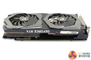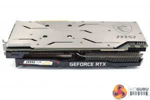 Moving over to the front side of the card, here you will notice there is no NVLink connector or SLI finger – with the new RTX 20-series cards, two-way SLI is only supported with the RTX 2080 and RTX 2080 Ti. The MSI logo on the left-hand side is one of the RGB lighting zones, while there is also some GeForce RTX branding in the middle of the card.