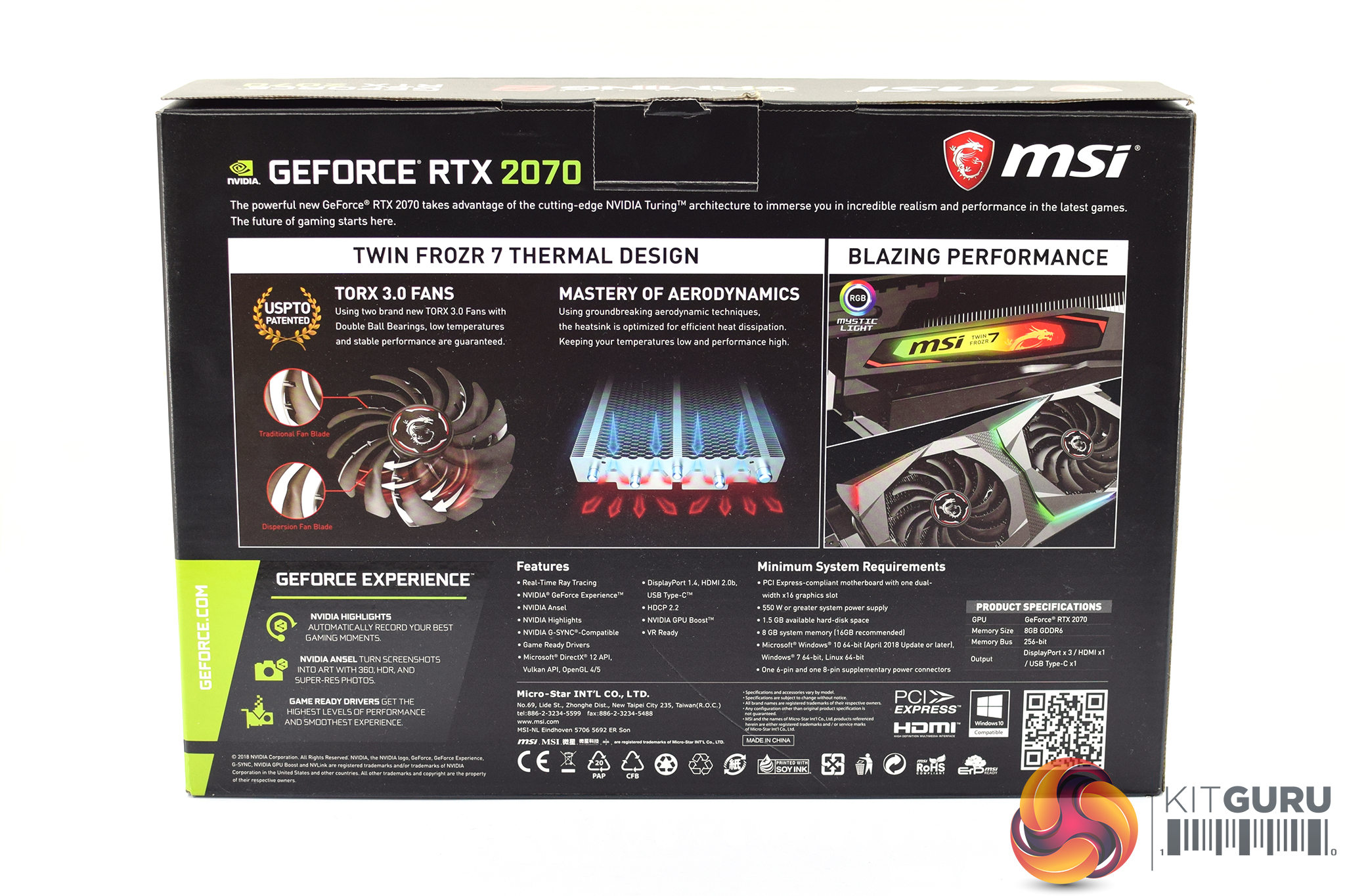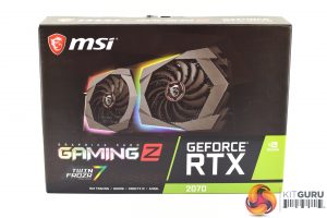 The MSI RTX 2070 Gaming Z 8G ships in a dark box with a big image of the card visible from the front – the eye-catching RGB lighting is clearly quite a feature.