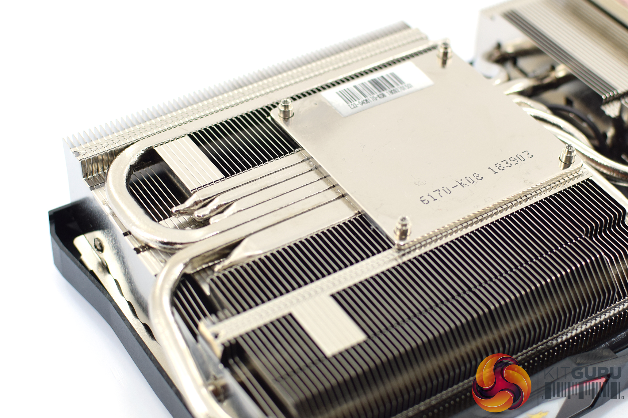 Cooling the GPU and VRM is MSI's 7th-generation Twin Frozr heatsink. This uses 6 nickel-plated heatpipes (which appear to be comprised of 1x 8mm and 5x 6mm pipes) and a nickel-plated copper baseplate to cool the GPU. MSI also says its heatpipes are as compact as possible where they touch the copper baseplate to ensure maximum thermal transfer.