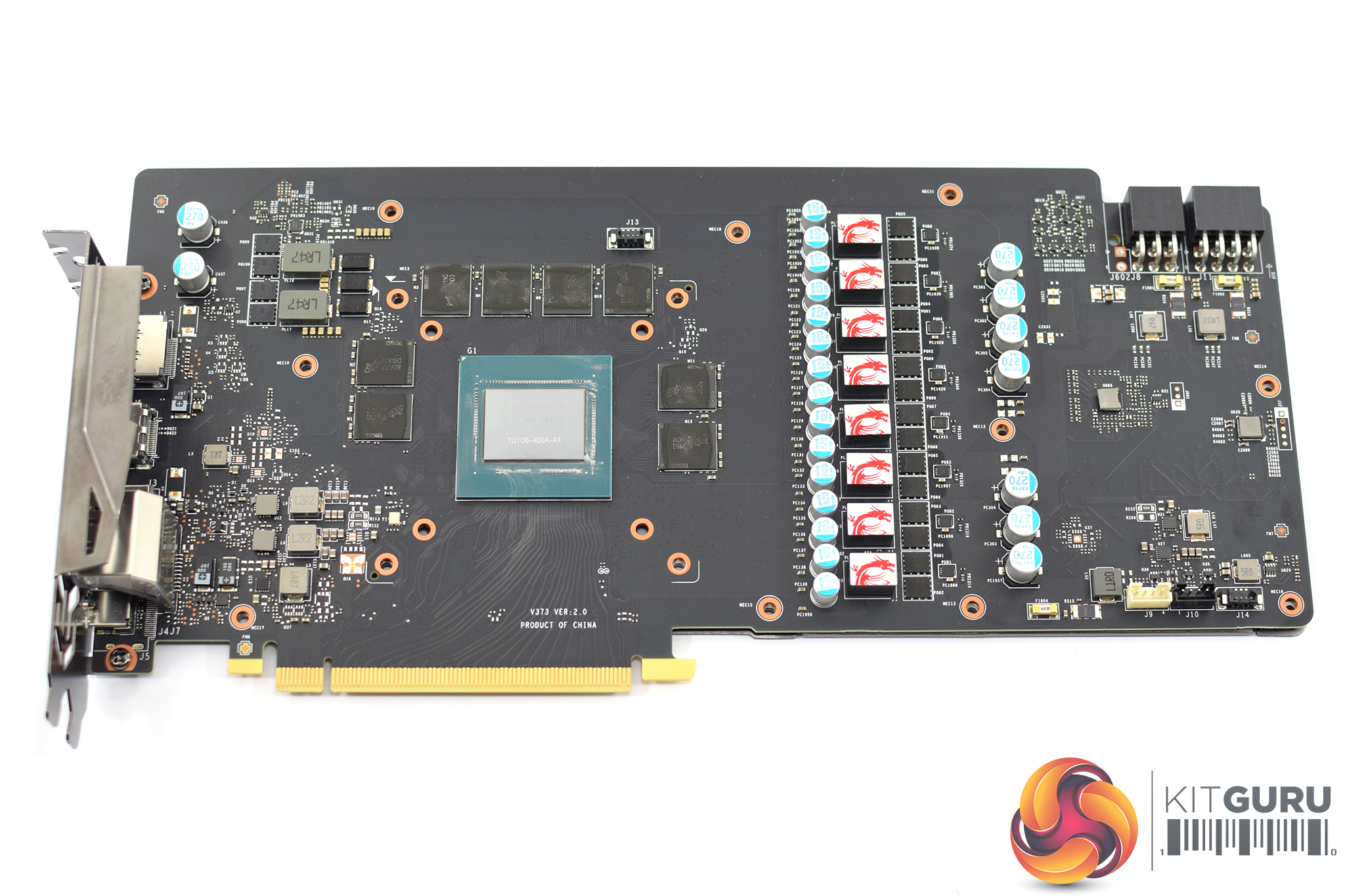That frame is removed by unscrewing two screws from the I/O bracket, and then we get a look at the PCB in all its glory. You will note that this is a custom board with an enhanced 8+2 power phase design – Nvidia's Founders Edition 2070 uses 6 power phases for the GPU, although I am not sure about the memory power delivery. I am also appreciative of the dragon design MSI has used on its inductors.